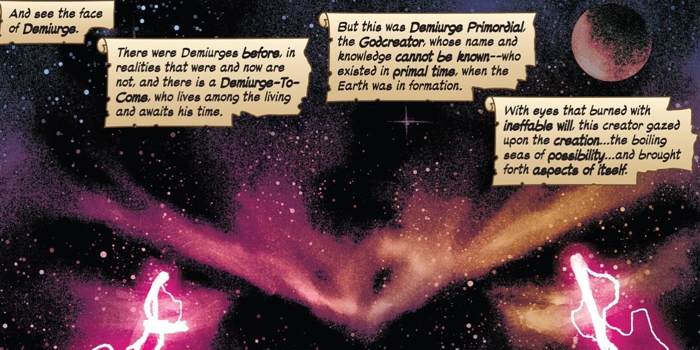 “/> El Demiurgo, llamado así por una figura de varias escuelas de filosofía antiguas, es uno de los seres cósmicos menos conocidos de Marvel, pero posiblemente uno de los más importantes. Apareciendo por primera vez en 1982. Thor Anual #10, el Demiurgo es responsable no solo de provocar vida en la Tierra, sino también de crear a los Dioses Mayores, uno de los cuales, Toranos, lucha contra Thor en este número. Estos Dioses Mayores libraron una guerra que casi destruye la Tierra infantil, si el Demiurgo no hubiera intervenido una vez más. Los Dioses Mayores huyen de nuestra realidad, pero continúan interviniendo en los asuntos de los mortales, como Toranos y Chthon, el autor del Fortaleza Oscura.