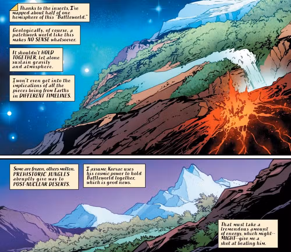 Sin embargo, Mundo de batalla introduce un nuevo giro en la historia. Mundo de batalla #2 – de – comienza con Hank Pym especulando que, si bien Korvac es un ser divino, mantener Battleworld probablemente le quite la mayor parte de su poder, dejándolo vulnerable a los ataques.