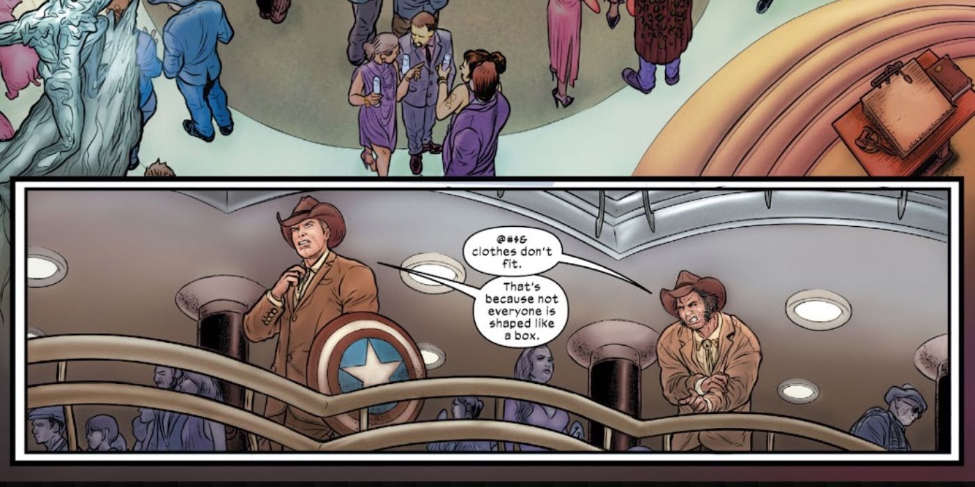 Al robar disfraces de dos guardias incapacitados, Wolverine se queja de que su ropa no le queda bien, a lo que Cap responde: “Eso es porque no todo el mundo tiene forma de caja”, enfatizando un aspecto clave de Wolverine, a menudo se le resta importancia en las adaptaciones del personaje: es muy bajo.