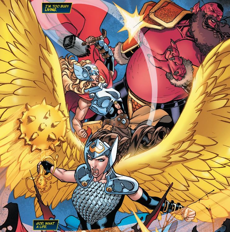 En el nuevo Vengadores #56Jane Foster se encuentra en una Wanda Vision-tipo fantasia creado por Mefisto y sus variantes. Al despertar al papel de ser la cariñosa esposa de Thor que cocina y limpia mientras el Dios del Trueno sale a salvar el día, Jane rápidamente se da cuenta de que esta no es su verdadera realidad. Además, también cuenta con la ayuda de una variante de sí misma que sigue siendo Mighty Thor. Trabajando juntas, ambas versiones heroicas de Jane luchan fácilmente contra Mephistos y Jane señala que esta tentación inventada nunca iba a funcionar. Si bien ser la novia o esposa de Thor podría haber sido algo que quería hace mucho tiempo, desde entonces ha crecido y su sueño ha evolucionado, uno que tuvo que vivir como Mighty Thor y ahora como Valkyrie.