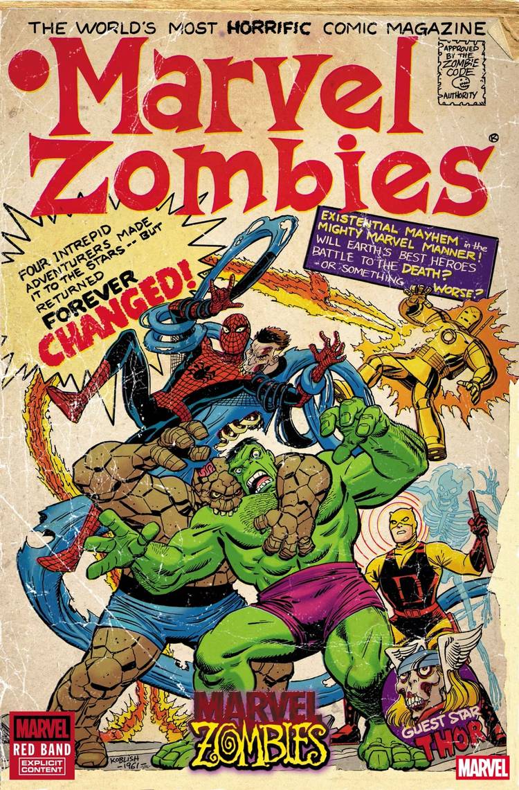 Quizás la portada más emocionante revelada para Marvel Zombies: Red Band #1 es la variante retro de Scott Koblish, realizada al estilo de una copia desgastada y conservada de un tema de los cómics Marvel de la era de la década de 1960. La portada incluye texto que promete “Mayhem existencial a la manera de Migh Marvel“Dar a los lectores solo una muestra de qué esperar de la serie cuando se estrena.