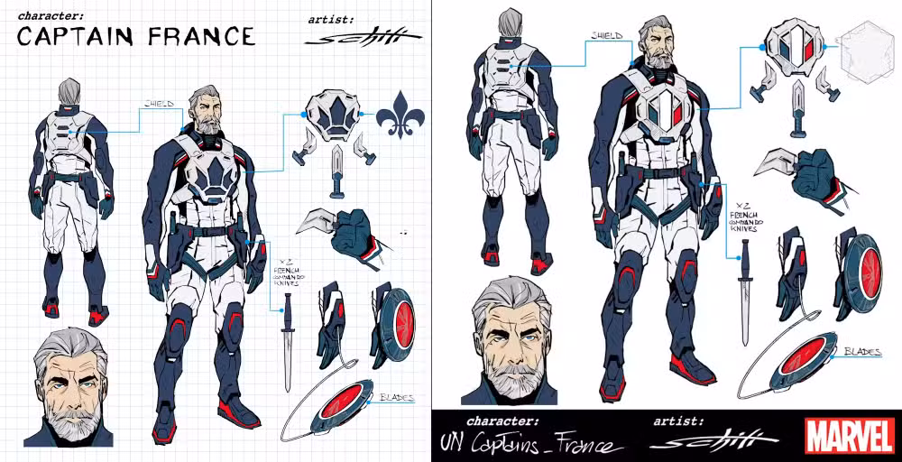 Es difícil lograr un cambio de planes tan descarado en el mejor de los escenarios, y mucho menos en uno que trata literalmente de política internacional (con estos héroes representando específicamente a los miembros permanentes del Consejo de Seguridad de las Naciones Unidas). Con los bocetos de diseño oficiales de los Capitanes revelados en un comunicado de prensa de Marvel junto con el Instagram personal del artista Valerio Schiti, ambos han sido eliminados.