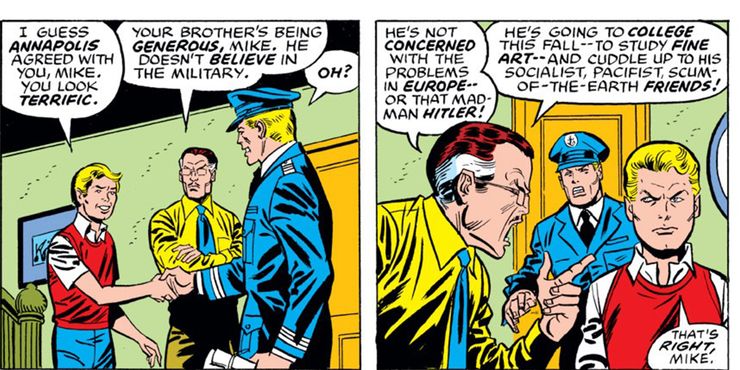 Los cambios de origen no se detuvieron ahí. Steve se dedicó a las artes, mientras que su hermano era una estrella del deporte, para gran decepción de su padre diplomático. Mike se convirtió en militar, mientras que Steve fue llamado socialista y pacifista por su padre. Steve dejaría su casa y estudiaría arte en la universidad. Pero, un día se entera de que su hermano fue asesinado en Pearl Harbor (no piense demasiado en la línea de tiempo, no tenía mucho sentido), lo que lo hace recurrir al ejército y eventualmente convertirse en Capitán América.