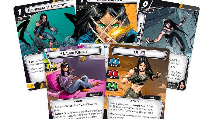 Marvel Champions: El juego de cartas es un juego de cartas vivientes en el que los jugadores usan un mazo basado en un héroe específico y trabajan con otros héroes para derrotar a los supervillanos y frustrar sus planes. Cada escenario tiene diferentes reglas y circunstancias, y los jugadores pueden optar por usar un mazo de héroe prediseñado o crear un mazo personalizado que use las cartas de un héroe específico junto con cartas de uno de los cuatro aspectos distintos. El juego de cartas se ha centrado exclusivamente en los X-Men durante el último año, con dos juegos en caja y una plétora de Hero Decks que respaldan a los personajes. X-23 sigue un ciclo que incluye a Cable, Domino, Psylocke y Angel como personajes jugables, con Cyclops, Jean Grey, Shadowcat, Colossus, Gambit, Rogue, Storm y Wolverine, todos disponibles anteriormente.