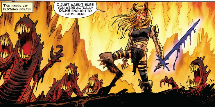 Cuando era niña, Illyana Rasputin se perdió trágicamente en la dimensión infernal del Limbo. Debido a que el tiempo fluye de manera diferente en el Limbo, pasaron años para Illyana antes de que regresara a la tierra, reapareciendo solo momentos después de su desaparición. Durante su tiempo en el exilio, Illyana fue “criada” por el demonio Belasco, quien la entrenó en el uso de la hechicería demoníaca. Estas magias oscuras se representan más comúnmente mediante el uso de su “Espada del alma”, un arma que se manifiesta a partir de una parte de su propia alma mortal que, aunque es extremadamente poderosa, también permite que las energías oscuras llenen el vacío resultante.