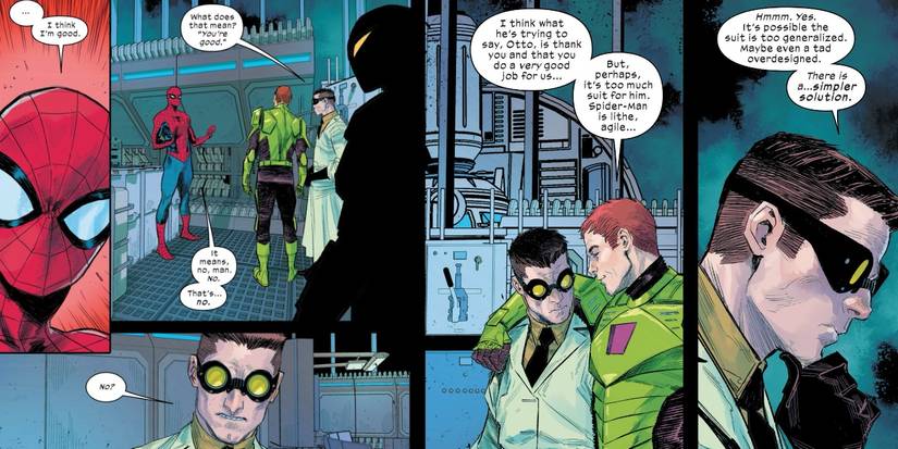 Esta nueva armadura creada por Octavius provoca una respuesta sorprendente de Peter Parker, quien finalmente rechaza el traje en favor de un traje de spandex más tradicional y simple (con algo de Kevlar mezclado). Confirmando que el traje es demasiado, incluso Otto admite que la armadura puede estar demasiado diseñada.. No es difícil ver de dónde viene Spider-Man, así como la probable excavación intencional en el MCU.