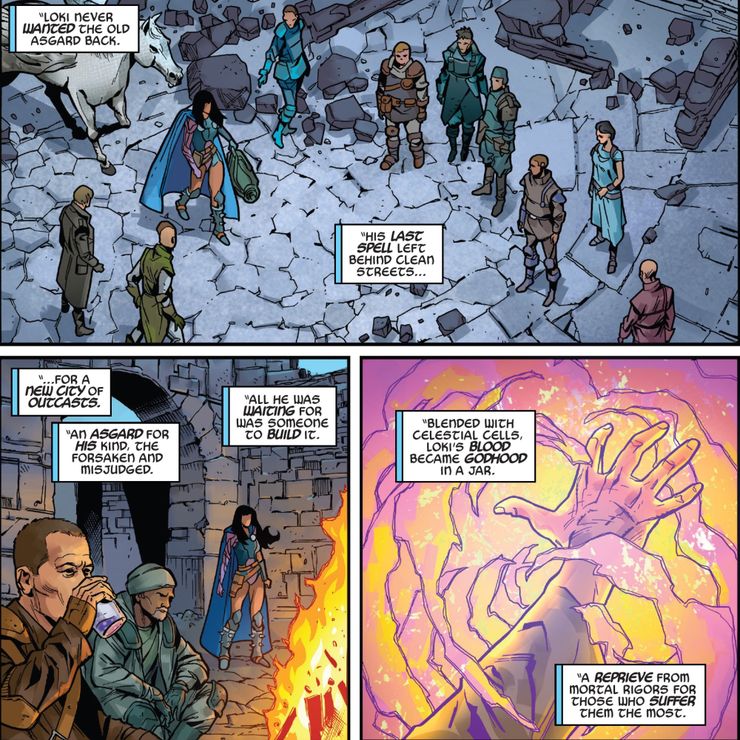 Como se ve en el nuevo Spider-Man 2099: Éxodo #2, Loki 2099 fue el último dios de Asgard después de que Alchemax destruyera el reino a través de un Ragnarok artificial de su propio diseño. Deambulando por los páramos antes de encontrar a esta nueva Valquiria (que desertó de Alchemax), los dos viajaron al Jardín Celestial. Recolectando fluido celular celestial, Loki pudo combinar la poderosa sustancia con lo último de su magia para restaurar a Asgard (sacrificándose en el proceso). Si bien la epopeya New Asgard de Loki no trajo de vuelta a los asgardianos originales, su sangre mágica combinada con las células celestiales dio como resultado la creación de una raza completamente nueva en el futuro potencial de Marvel.