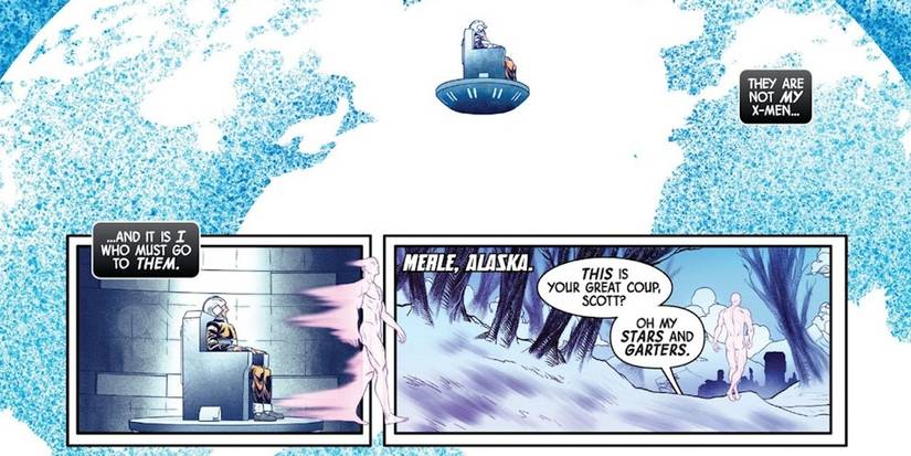 Cuando Charles Xavier es llevado por primera vez a su celda, recuerda Reed Richards se siente avergonzado por el mejor intento que se les ocurrió para contenerlo, especialmente después de que Xavier señala: “Puedes enjaular mi cuerpo, pero mi mente es libre“. Tony Stark intenta asegurarle a su compañero de equipo Illuminati que el hardware antipsíquico utilizado para crear esta célula debería ser suficiente para contener a Xavier. Sin embargo, como lo demuestra el resto del número, eso no podría estar más lejos de la verdad.