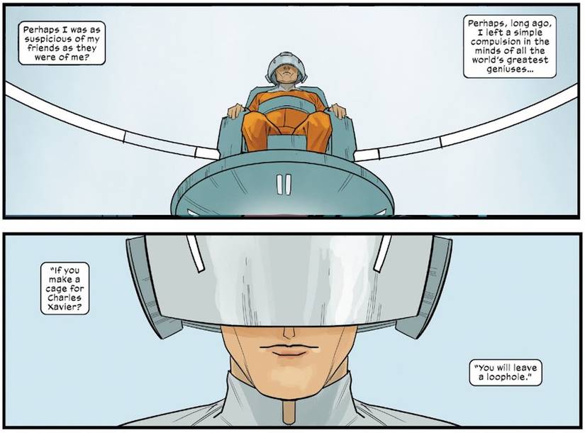 Ni siquiera los dos supergenios más grandes que tiene Marvel pueden encontrar un medio adecuado para detener al Profesor X, pero según la planificación de Xavier, todo esto es por diseño. Xavier revela que dejó una sugerencia post-hipnótica de que si Reed Richards alguna vez lo enjaula, debería dejar un resquicio que le permita escapar.. Funcionó, y el ex líder de los X-Men procede a usar su telepatía para dejar que su mente vague sin rumbo por el mundo. Reed es el hombre más inteligente del mundo, pero No puedes superar a alguien que puede reprogramar los pensamientos que te permiten tener..