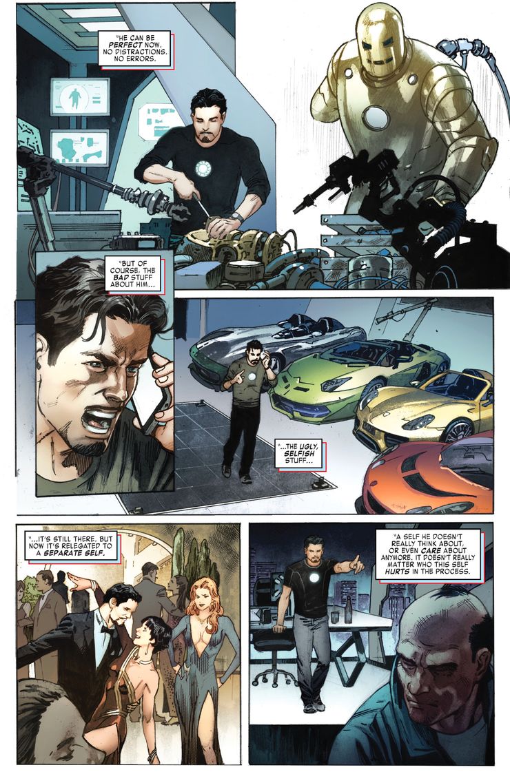 Tony es una de las personas más inteligentes del universo, un hombre de negocios consumado, un héroe amado que salvó la Tierra muchas veces y, sin embargo, a pesar de todo eso, todavía está atrapado en su pasado. Está constantemente pensando en la influencia que su padre tiene sobre él y, como resultado, no puede avanzar realmente. Iron Man está constantemente agobiado por la idea de que de alguna manera es incapaz de alcanzar su máximo potencial: es y siempre será una decepción para su padre, incluso ahora que se ha convertido en un dios. Cuando Patsy explica que su madre también tenía expectativas poco realistas para ella, Tony usa la historia de Dr. Jekyll y Mr. Hyde como una poderosa metáfora de lo que significa para él ser un héroe. Sin embargo, el mismo razonamiento se puede aplicar a la mayoría de los superhéroes de Marvel.