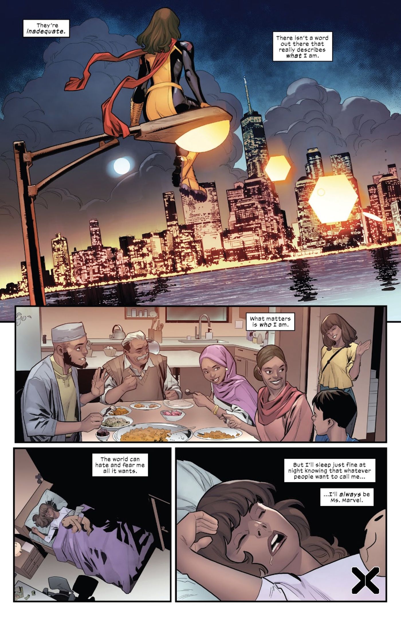 Mantener su personalidad heroica ha sido importante para Kamala desde el comienzo de la Caída de X. En su miniserie en solitario, Sra. Marvel: La nueva mutante, llega a la conclusión de que incluso si su condición de mutante trae consigo nuevos poderes o nuevas batallas que librar, Ms. Marvel siempre permanecerá fiel a quién es. Conservará esta mentalidad mientras continúa luchando contra las fuerzas que acabarían con ella y sus compañeros mutantes.