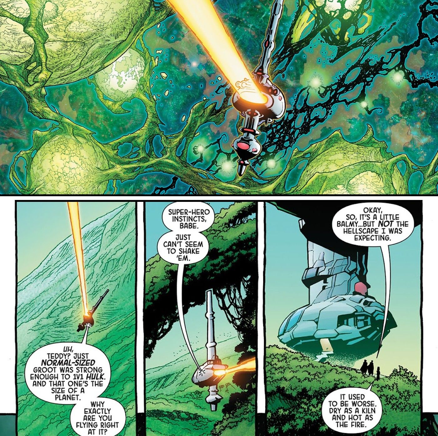 En Guardianes de la Galaxia #7 – por Jackson Lanzing, Collin Kelly, Kev Walker, Matt Hollingsworth y Cory Petit – Wiccan y Hulkling se aventuran en Grootspace, la nueva forma de Groot después de unirse con el resto de los Guardianes de la Galaxia. Al aterrizar, Wiccan señala que “Groot era lo suficientemente fuerte como para enfrentarse a Hulk 1 contra 1” incluso antes de que se transformara.