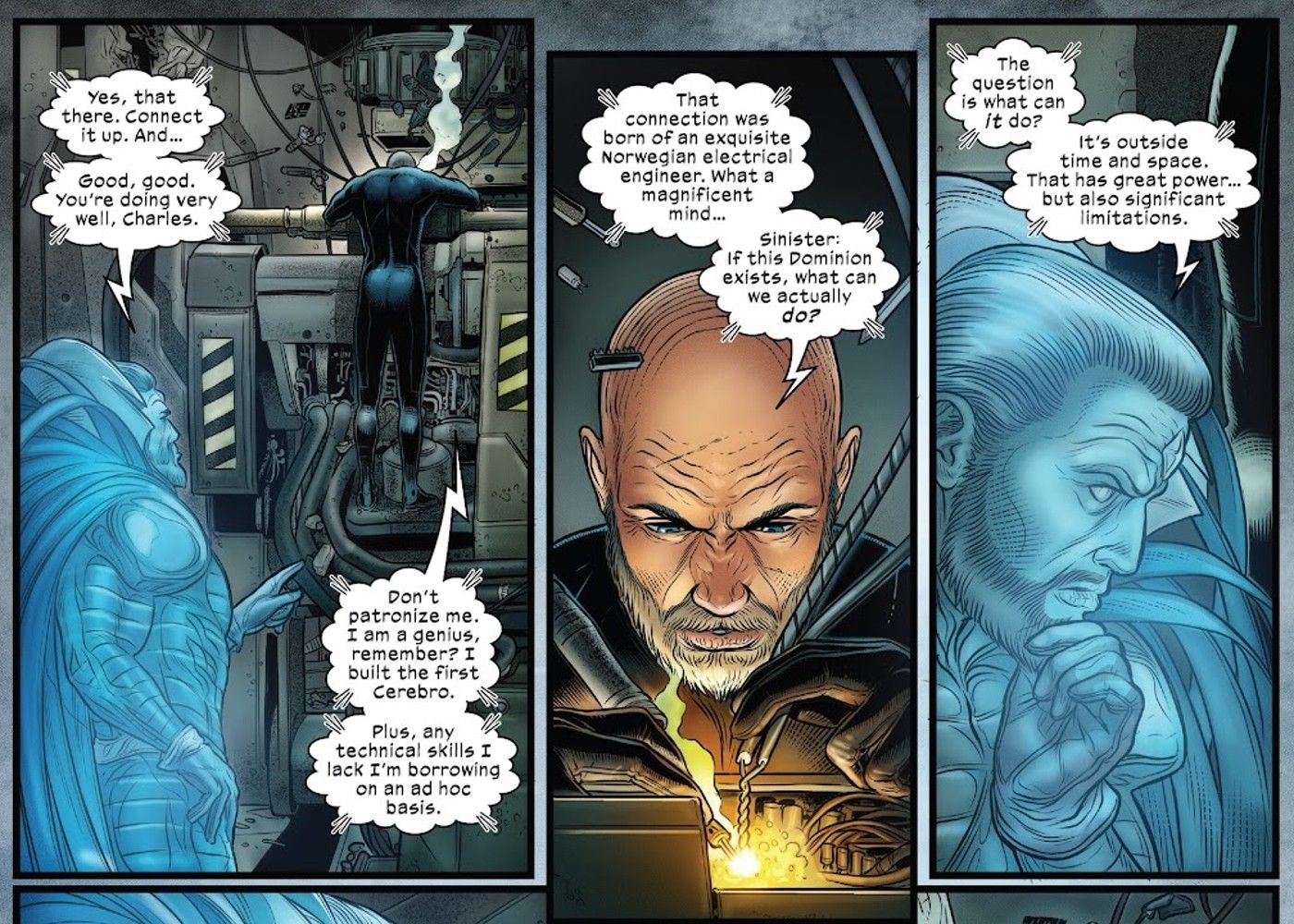 X-Men inmortales #18, de Kieron Gillen, Juan José Ryp, David Curiel y Clayton Cowles de VC, encuentra al profesor Xavier infiltrándose en lo que queda del laboratorio de Muir Island de Mister Sinister, con la proyección astral de Essex a cuestas. Al intentar reconstruir el motor Moira de Sinister para obtener información sobre el Dominio, Charles no tiene más remedio que reparar el dispositivo él mismo.