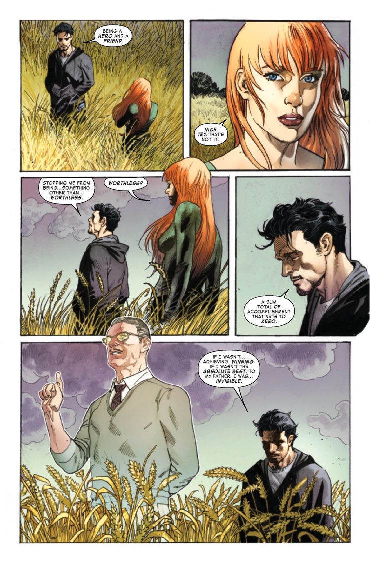 En Hombre de Acero # 18, Tony acepta sus acciones después de adquirir el Poder Cósmico y convertirse en el Dios de Hierro. Casi omnipotente, todavía lo arrastraba su pasado, especialmente su relación con su padre Howard. Incapaz de aceptar las críticas por sus elecciones, Tony terminó matando a algunos de sus amigos más cercanos. Se da cuenta de que su principal objetivo en la vida siempre ha sido no sentirse inútil. “Si no era absolutamente el mejor, para mi padre era invisible“, dice Tony. Tal complejo de inferioridad sería comprensible, considerando que Howard Stark fue un genio inventor e industrial, pero no tiene mucho sentido a la luz de todo lo que Tony logró en su vida. Solo contando las veces que salvó la Tierra, o el Universo, sería suficiente, pero no lo es. Sigue enfocándose en sus errores, sin darse cuenta de que son causados por su incapacidad para dejar atrás el pasado.