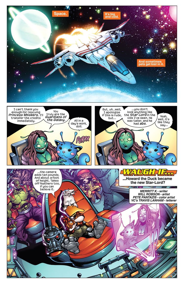 La acción se desarrolla en la historia “¿Waugh If? Howard the Duck Became the New Star-Lord”, de Merritt K y Will Robson, que aparece en Howard el pato #1. Howard the Duck es el nuevo Star-Lord, habiendo obtenido el título por medios poco honorables, molestó a Kitty Pryde, quien ocupaba el mando cuando Howard firmó con los Guardianes. Pryde dejó a los Guardianes y Howard comenzó a llamarse a sí mismo el nuevo Star-Lord.