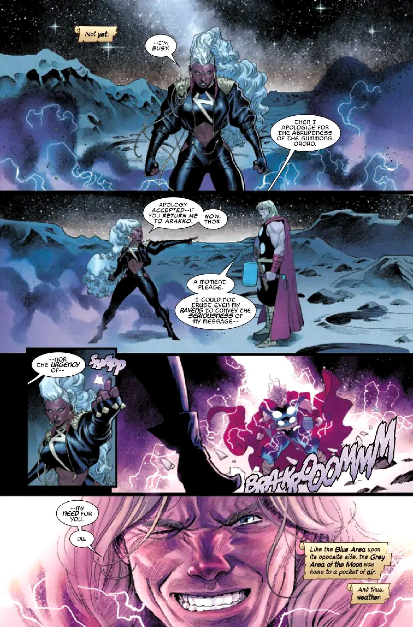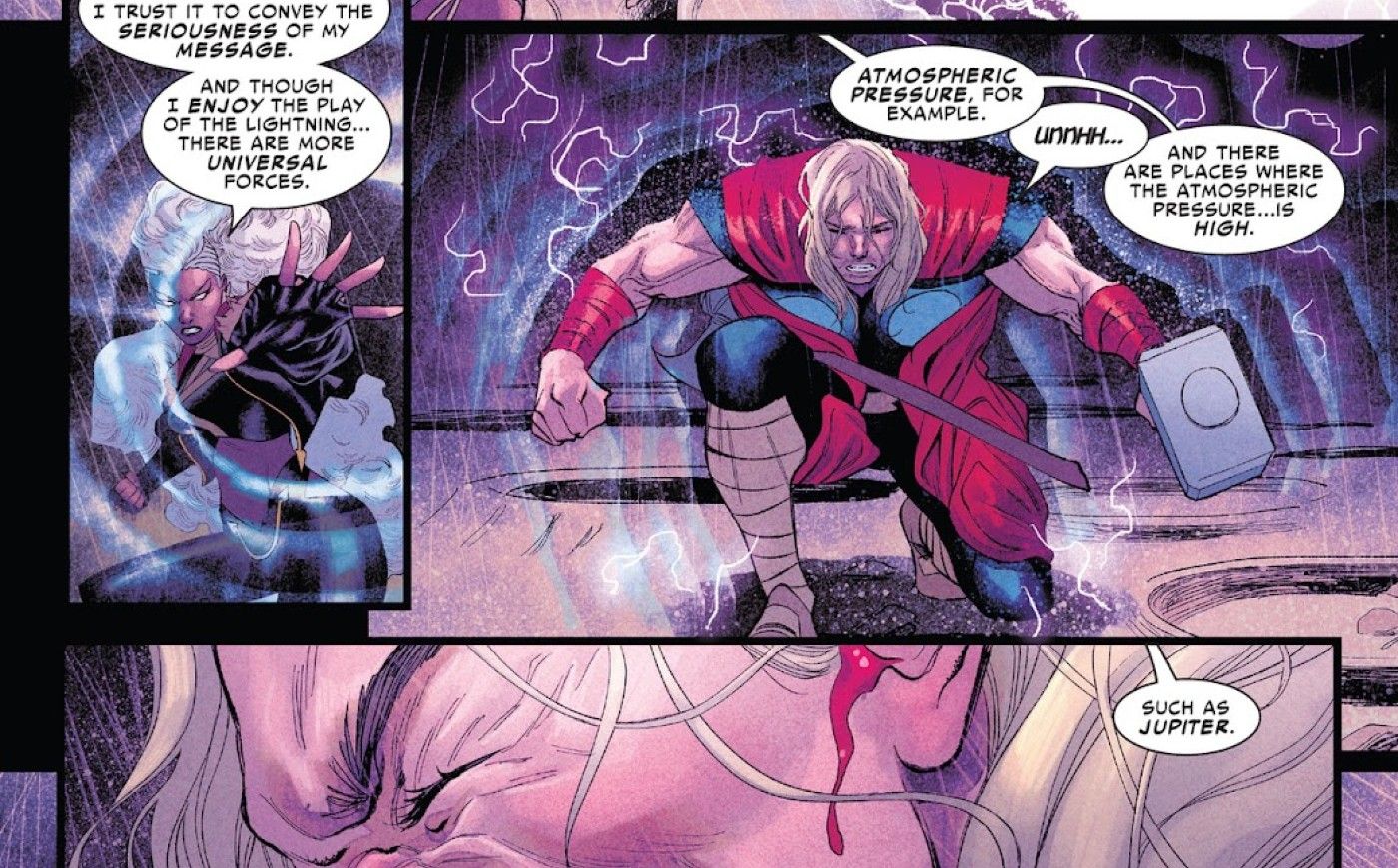 “/> Sin embargo, Storm no está precisamente feliz de verse apartada de una guerra por el destino del sistema solar. La narración señala que la magia dentro de ella no es lo suficientemente poderosa como para resistir la convocatoria de Thor, pero señala siniestramente “aún no.” Tormenta pierde los estribos con Thor cuando él se niega a enviarla de regreso y lo golpea con un rayo, entregando suficiente poder que incluso el Dios del Trueno deja escapar un pequeño rayo. “Ay.” Cuando Thor redirige el rayo de Storm, ella ataca manipulando la presión atmosférica, extrayendo sangre de su piadoso oponente.