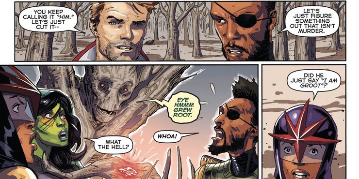 Resulta que este árbol estaba vivo. Por supuesto, este árbol era el Guardian of the Galaxy Groot favorito de los fanáticos. En esta historia, los Guardianes aún no se habían reunido, por lo que esta fue la primera vez que se reunieron. Al principio, Gamora cree que alguien se esconde dentro del árbol, pero el árbol sorprende a todos cuando revela que tiene ojos. Mientras contempla dónde está la piedra, Anwen pronuncia “hmmm”, mientras que su hermano piensa que el árbol creció sobre la piedra. Finalmente, piensan que la piedra está en las raíces del árbol. Poner todas estas palabras juntas deletrea “ojo hmmm creció raíz”. El árbol repite esto, que Anwen cree que estaba diciendo: “Soy Groot”, y así nació un eslogan.