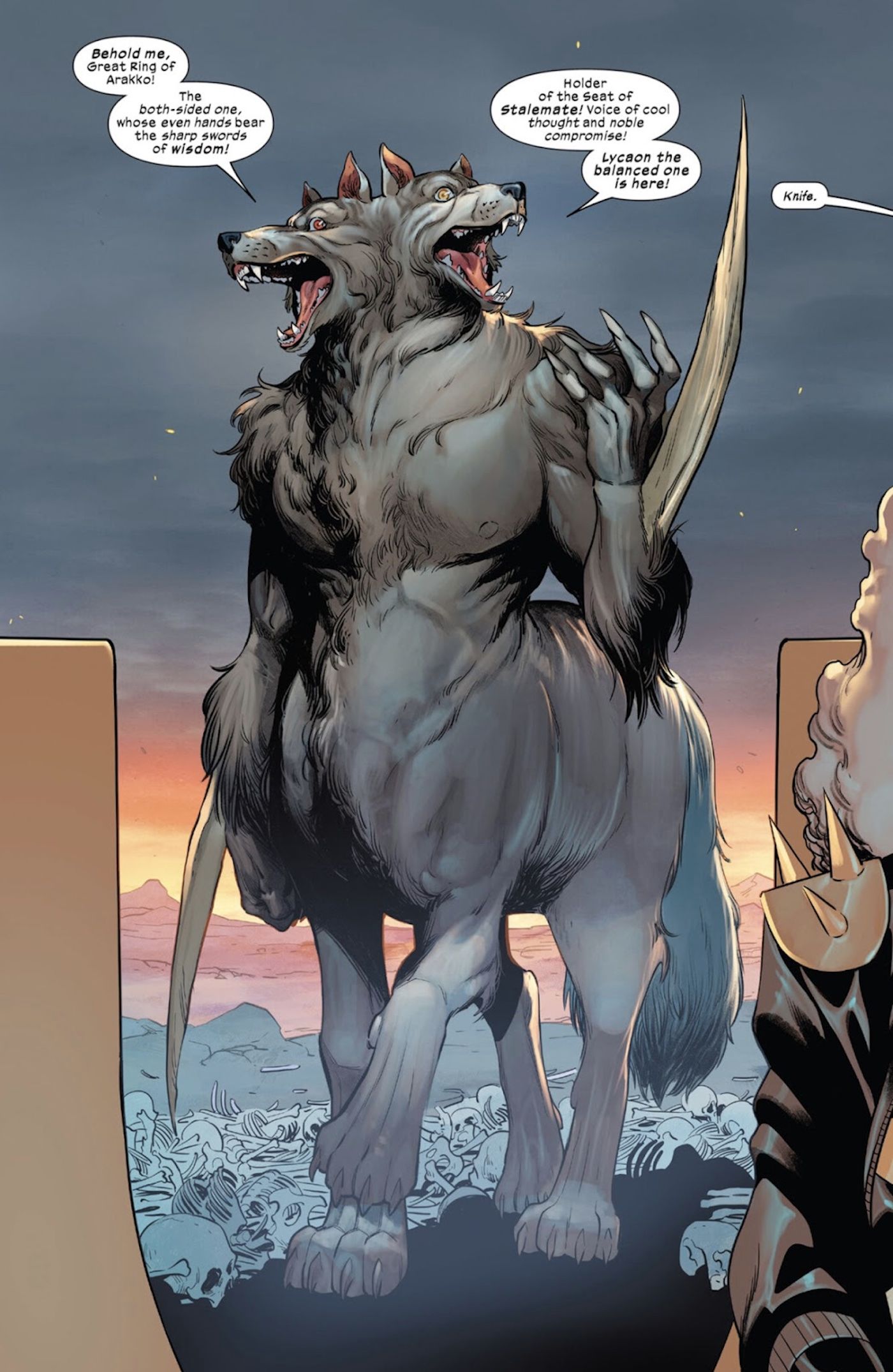 “/> Durante las apariciones iniciales de Lyacon en las páginas de X-Men Rojo, se habló mucho de su obsesión intrínseca por el equilibrio y la dualidad provocada por sus cabezas duales. De esta manera, fue un contraste perfecto para el propio Wolverine, ya que Logan frecuentemente lucha con el acto de equilibrio entre su naturaleza más oscura y bestial y el noble guerrero que sus amigos y fanáticos de X-Men han llegado a conocer y amar. Pero con la derrota de Génesis, queda claro que a Lycaon nunca le importó el equilibrio: era simplemente un absolutista que quería poco más que control y dominación totales, y nada como Canucklehead, revestido de adamantium, que supuestamente era su inferior.