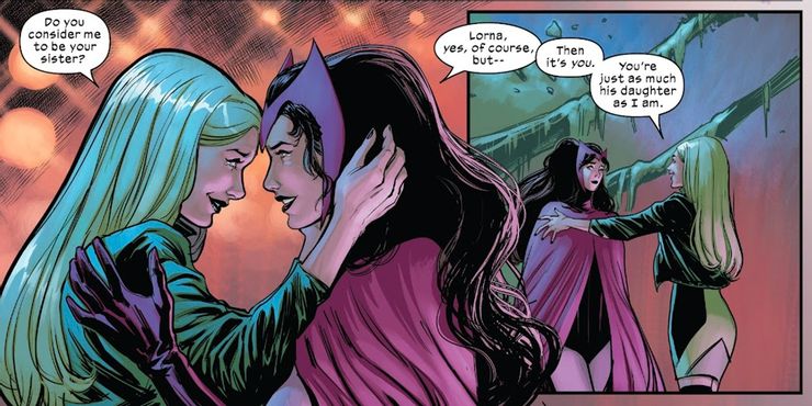 El hechizo que está lanzando Scarlet Witch requiere que tres personas, la descendencia de los tres fundadores de Krakoa, creen un vínculo mágico, por lo que Wanda primero reúne a Lorna, la verdadera hija biológica de Magneto, Legion y Proteus, y sin embargo, el hechizo no funciona. Lorna se da cuenta de que es Wanda quien debería ser la tercera participante en el hechizo, pero Wanda no cree que sea posible ya que no está relacionada biológicamente con Magneto. Lorna le pregunta a Wanda si la considera su hermana, a lo que Wanda está de acuerdo de todo corazón antes de que Polaris diga: Eres tan hija suya como yo. Después de intentar el hechizo de nuevo, funciona, y Scarlet Witch es capaz de convertirse en “El Redentor” a los ojos de los mutantes, lo que demuestra que, al menos mágicamente, se la considera la hija de Magneto.