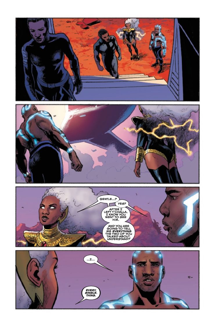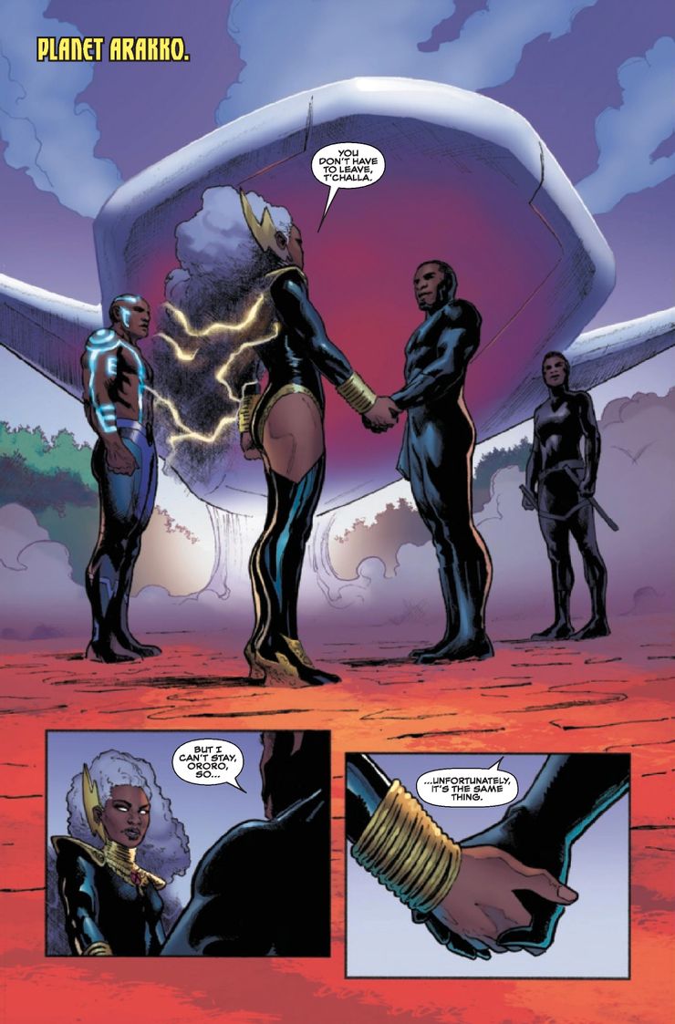 Aunque lo anterior Pantera Negra #3 vio a T’Challa viniendo al planeta mutante de Arakko (anteriormente Marte) con el pretexto de pasar desapercibido después de salvar a uno de sus agentes durmientes, en realidad estaba allí por otra razón. Aunque él y el mutante wakandiano Gentle hicieron una demostración de hostilidad para que pareciera que Gentle odiaba a T’Challa, más tarde se reveló que Gentle es uno de los durmientes de Black Panther. A pesar de que Arakko es una creación bastante nueva hecha por mutantes con Storm como su regente, Black Panther aún colocó a un asesino durmiente en Marte en caso de que alguna vez se convierta en una amenaza para Wakanda (mientras que él y Storm han reanudado recientemente su romance). Ahora, la vista previa de Pantera Negra #4 de John Ridley, Juann Cabal e Ibrahim Moustafa revela que Storm sabe mucho más de lo que supone Black Panther. Aquí están las páginas de vista previa y la sinopsis del próximo número: