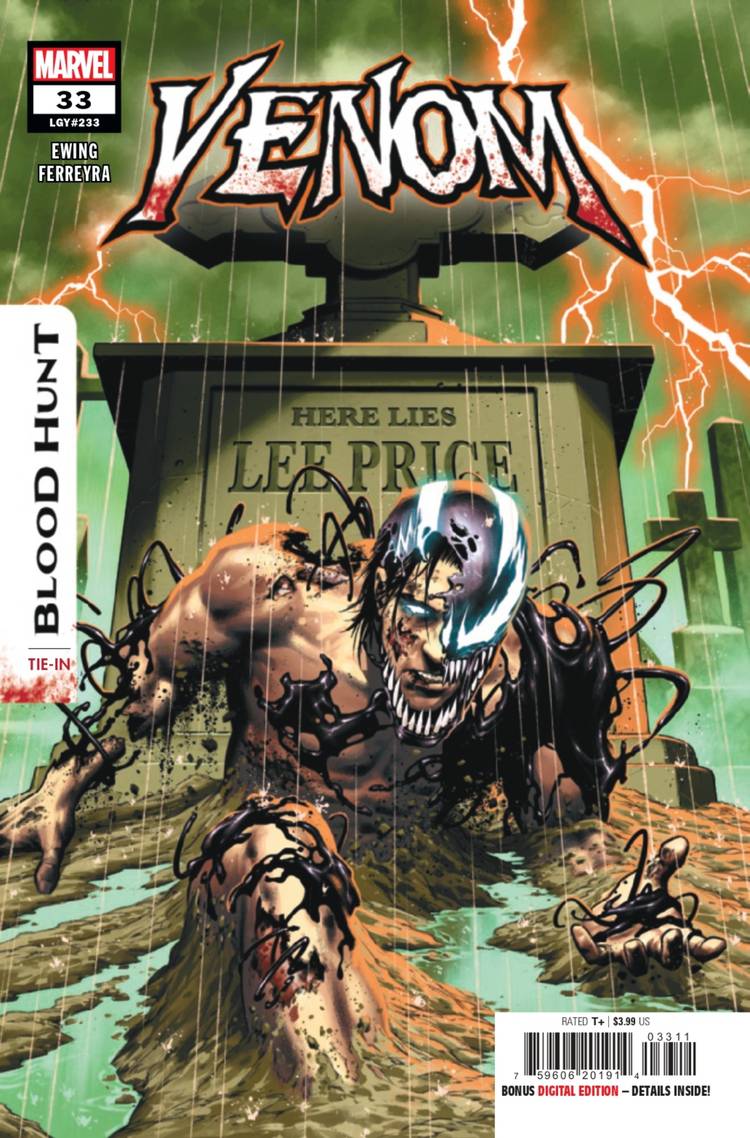 Mientras tanto, Venom se queda sin anfitrión, ya que cree que Dylan Brock está muerto. Entonces, para luchar contra este nuevo enemigo, Venom tendrá que vincularse con el cadáver de otro ex presentador, Lee Price (que aparece en la portada de este avance, así como en la descripción oficial, como se ve arriba). Sin embargo, eso puede no ser suficiente para mantener a Venom a salvo del vampiro devorador de simbiontes, especialmente porque las hordas de muertos vivientes están causando estragos a su alrededor.