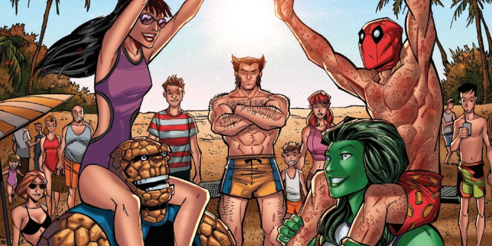 En Marvel Swimsuit Special: amigos, enemigos y rivales #1, escrito por Tim Seeley y Tony Fleecs, con arte de Nick Bradshaw, los superhéroes de Marvel en todo el mundo se adaptan a sus trajes de baño.