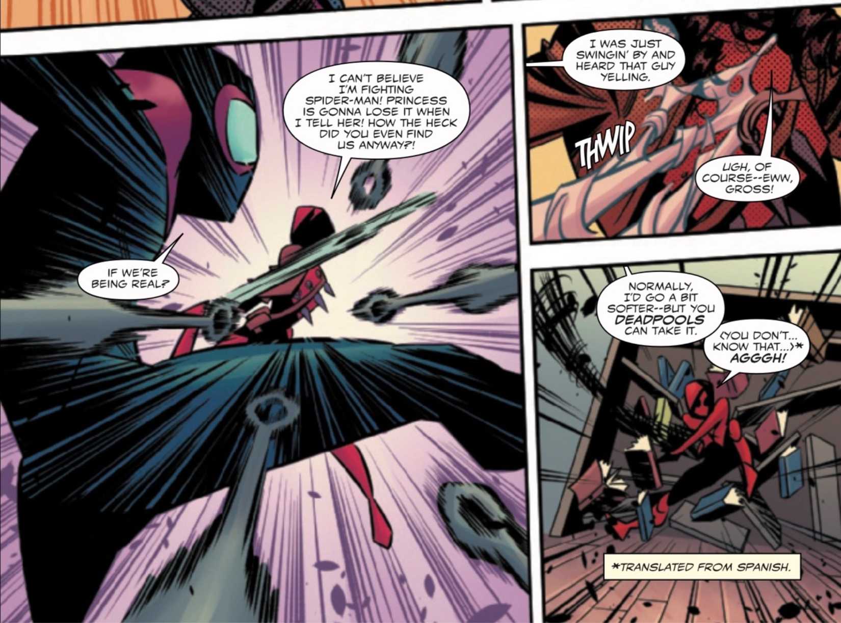 Aunque el Spider-Man más experimentado tiene un poco de ventaja en su primera pelea, el fanático Deadpool se mantiene firme antes de escapar con la ayuda de Taskmaster. La próxima generación de la pareja creó su propia versión de la amistad de Marvel.