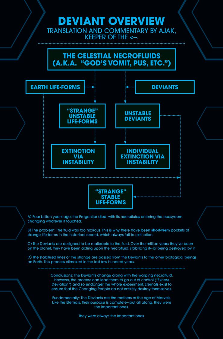 >Lectores de Vengadores deben estar familiarizados con su base de operaciones, el Celestial muerto llamado Progenitor, quien, hace miles de millones de años, se estrelló en la Tierra, muriendo de una infección causada por parásitos espaciales. Los fluidos infectados del dios moribundo se vertieron en la fértil Tierra primordial y cambiaron el planeta para siempre, convirtiéndolo en un caldo de cultivo para individuos con superpoderes que actuarían como el “sistema de defensa” del planeta. eternos El número 12, de Kieron Gillen, Esad Ribic y Matthew Wilson, agrega una pieza importante a esa historia. Los fluidos corporales del Progenitor eran demasiado nocivos para producir formas de vida “extrañas” estables. Entonces, los Celestiales crearon a los Deviants para que actuaran como “estabilizadores” de los fluidos. Luego transmiten las sustancias mutagénicas estables a los seres biológicos nativos de la Tierra, creando formas de vida estables “extrañas” (es decir, superpoderosas). Este proceso llegó a su clímax en los últimos siglos, convirtiendo a los Deviants en “las madres de la era de las maravillas“.