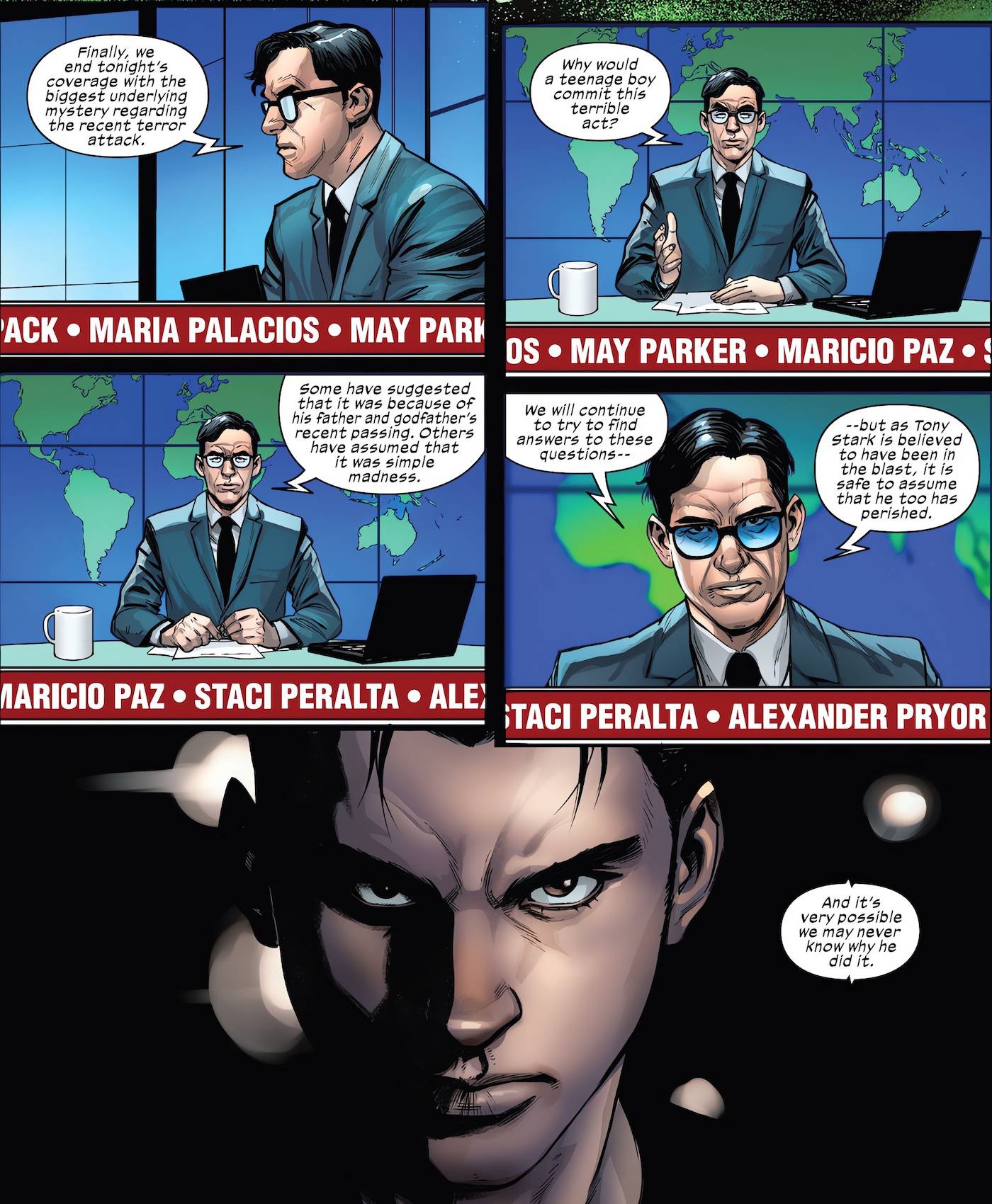Una de las razones por las que este nuevo status quo es tan efectivo es cómo se ha desarrollado en otros títulos de Ultimate Universe. El nuevo El último Spider-Man es el ejemplo perfecto. El libro se ha centrado en gran medida en el costo personal del ataque terrorista en Nueva York, que mató a la tía May y a Norman Osborn, entre otros. También se muestra cómo el Consejo de Creadores está manipulando las noticias, difundiendo propaganda a través de Kingpin. Bugle diario. Los lectores no sólo saben cómo se puede difundir la información errónea sobre los Ultimates, sino también por qué. gente normal Probablemente también estará en contra del equipo si está asociado con Tony..