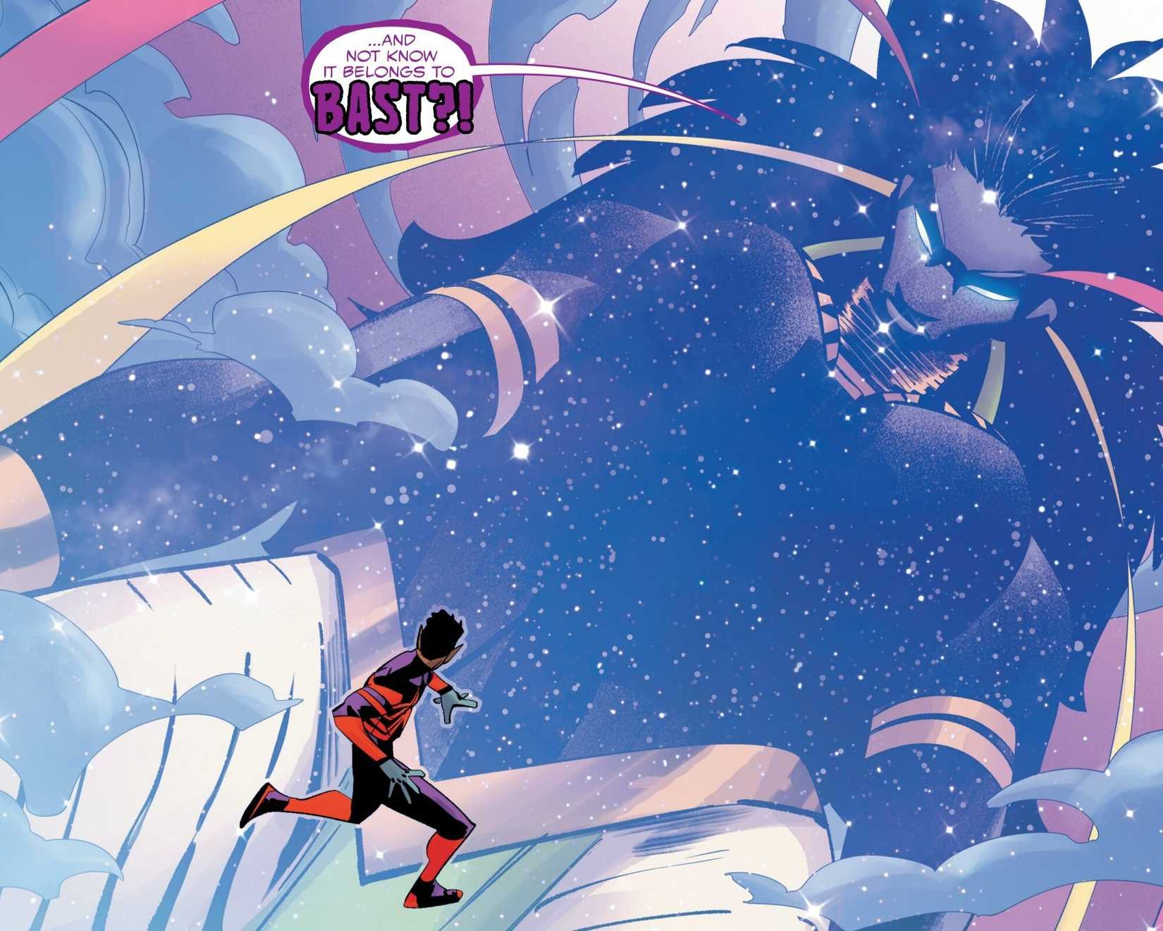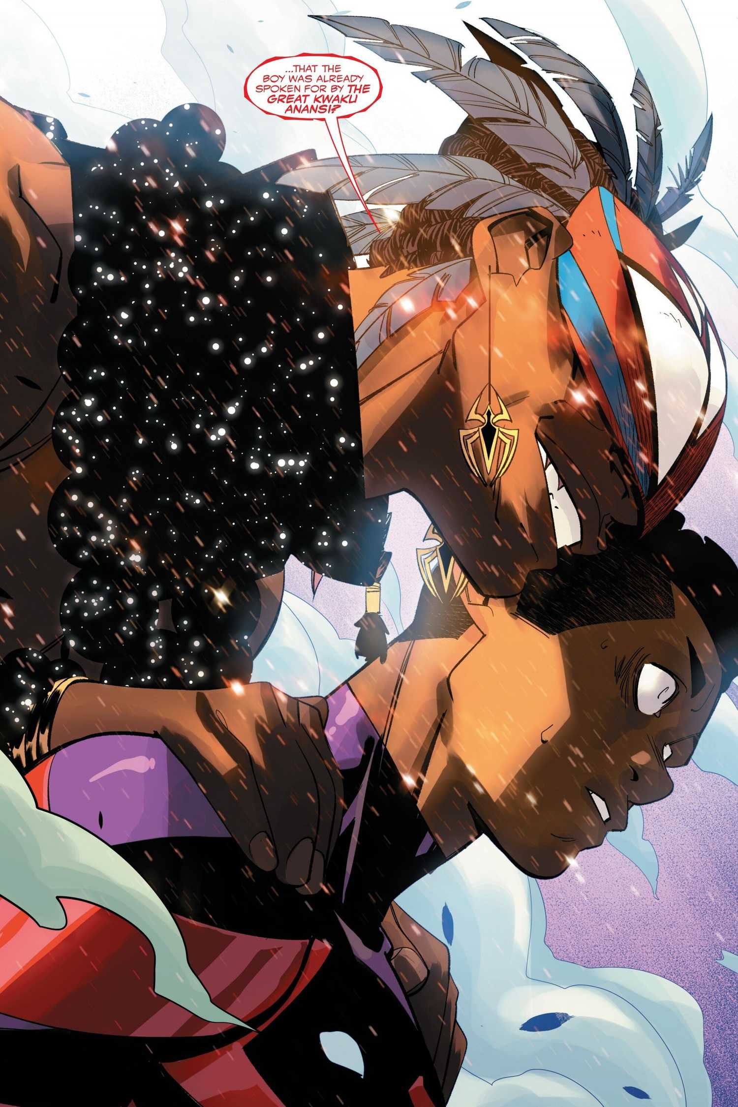 Aparece Bast, enfurecido con T’Challa por traer a Miles a su reino. Sin embargo, mientras el dúo cree que ella está enfurecida por haber traído un vampiro, ella revela que otro de su panteón ya ha reclamado a Miles como su heraldo. Con una sonrisa tortuosa, aparece el dios araña Kwaku Anansi, que cuenta historias.