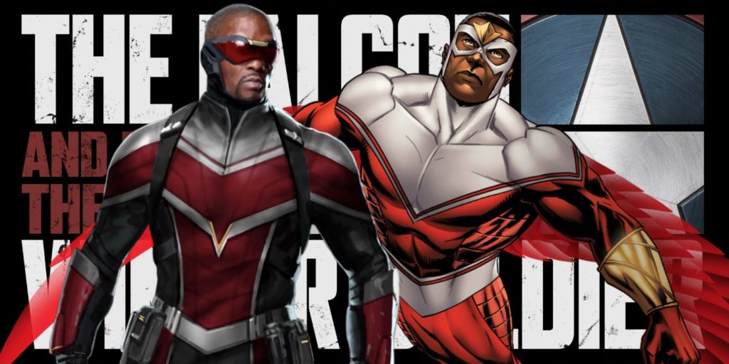 El lanzamiento de Disney + incluyó el especial de Marvel, "Expanding the Universe", que presentó arte conceptual e imágenes de personajes de los nuevos programas de Disney + de Marvel. Una de estas imágenes proporcionó una mirada cercana al nuevo traje de Falcon. El disfraz tiene un esquema de color rojo, blanco y gris. El rojo y el blanco son los colores de muchos de los trajes clásicos de Falcon en Marvel Comics. Aunque puede ser una combinación de múltiples versiones, los colores y el diseño del traje se parecen mucho al traje que usó Sam Wilson a principios y mediados de la década de 2000.