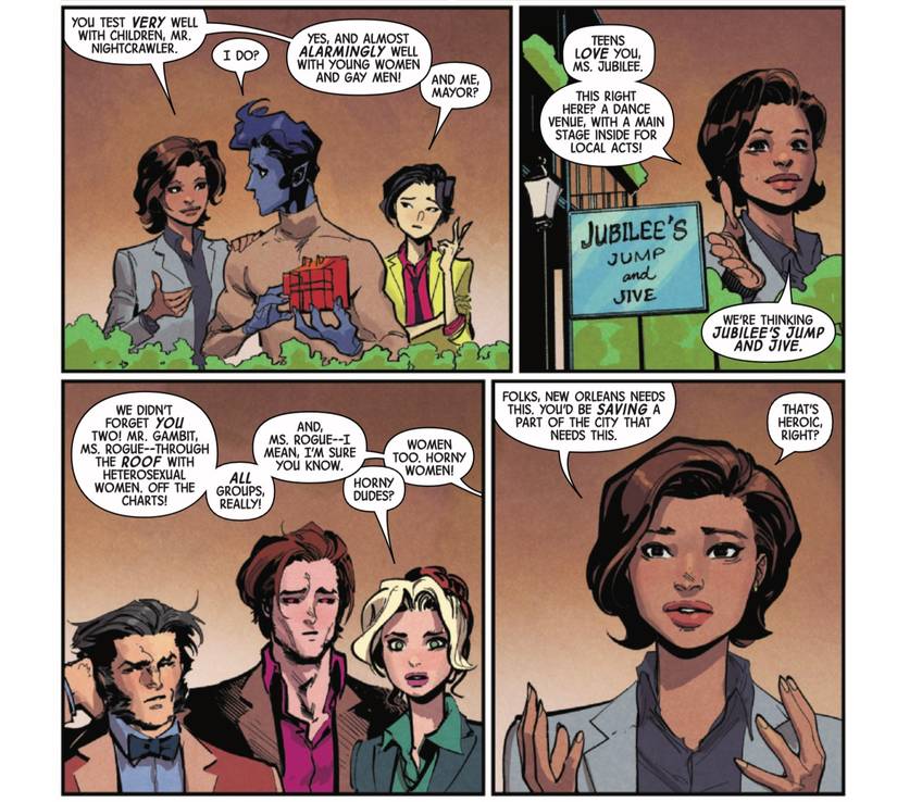 Si bien el alcalde detalla cómo los diversos miembros del equipo X-Men prueban con diferentes tipos de grupos, el personaje hace un punto para llamar específicamente el atractivo de Rogue tanto para ambos “tipos cachondos” y “Mujeres cachondas“. Sin embargo, el punto podría extenderse a muchos de los héroes más populares de la franquicia, especialmente porque los X-Men han sido considerados los personajes más cachondos de Marvel en Canon.