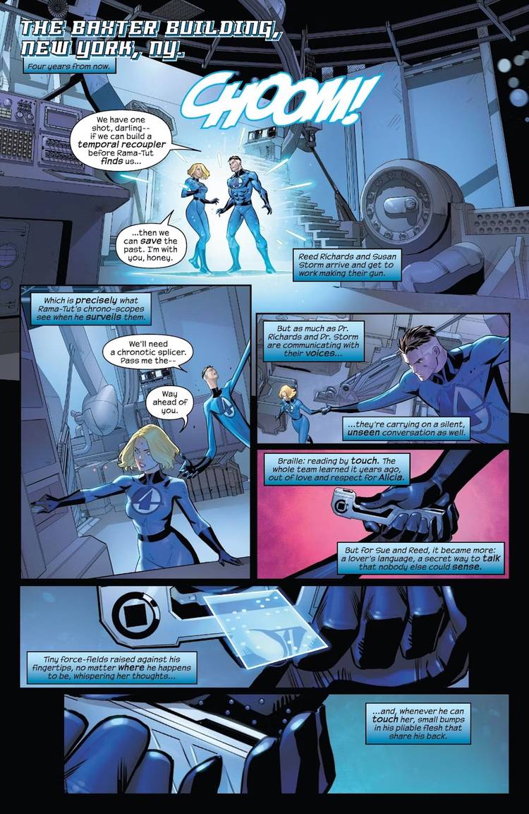 Cuatro Fantásticos El número 19, de Ryan North, Carlos Gómez, Jesús Aburtov y Joe Caramagna, es el último de una serie de números que describen las inmensas contribuciones de Alicia al equipo. El resto de los Cuatro nunca deja de impresionar y recientemente han llevado sus propias habilidades a nuevas alturas, pero es Alicia quien sorprendentemente tiene la mayor responsabilidad.