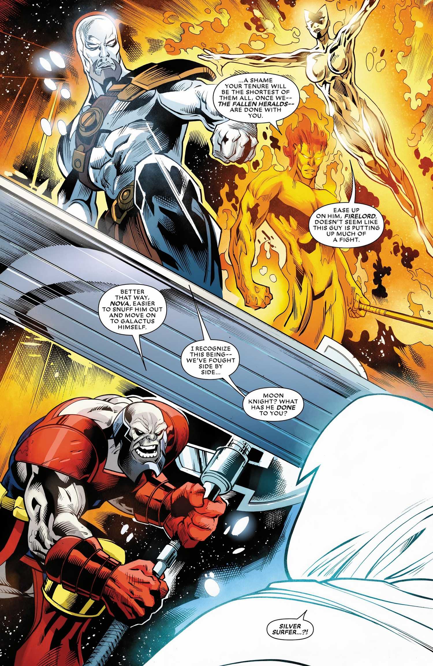¿Y si … Galactus transformó Moon Knight? #1 está escrito por Alex Segura y dibujado por Scot Eaton y Chris Campana. Tan pronto como Galactus le da a Moon Knight el poder cósmico, el surfista plateado da a conocer su presencia. El surfista está acompañado por tres antiguos heraldos de Galactus: Nova (Frankie Raye), Terrax y Firelord. Los antiguos heraldos todavía están amamantando el rencor contra Galactus y sacan su ira a Moon Knight. Los cuatro antiguos heraldos golpearon a Moon Knight con todo su poder, y el dolor por el héroe con potencia cósmicamente es casi demasiado para soportar.