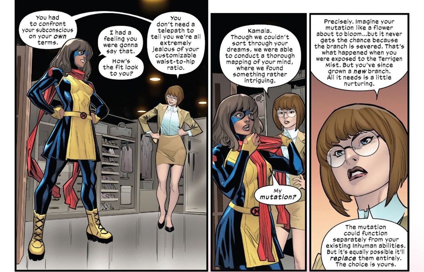 “/> La mayor parte de esta serie ha aludido a que el gen mutante de Kamala posiblemente algún día le dará un nuevo poder, o al menos le ofrecerá el potencial de otorgarle un mayor poder. La organización antimutante Orchis intenta sacar provecho de este conocimiento con un caballo de Troya mortal que resulta contraproducente cuando Ms. Marvel se niega a cambiar y tiene una discusión similar con Emma Frost en este número. Si bien Marvel aún no ha revelado el nuevo poder mutante de Kamala, Emma le dice que cuando fue golpeada por Terrigen Mist que le dio poderes inhumanos, cortó la rama que habría permitido que su poder mutante floreciera.