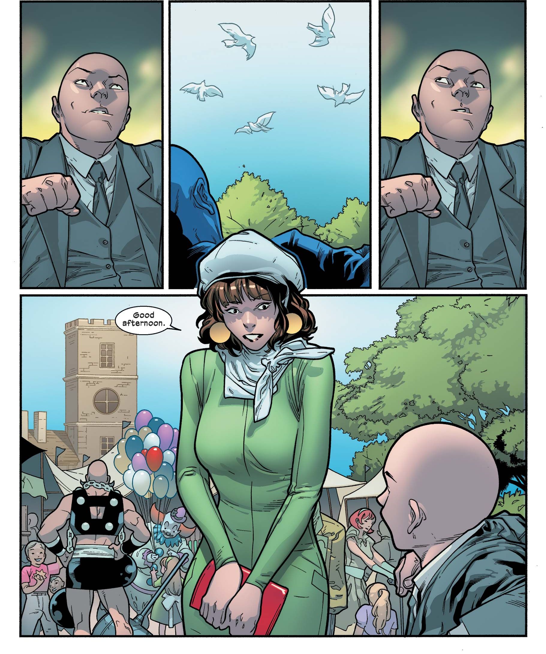 El momento del banco del parque al que se refiere Gillen se ve por primera vez en Poderes de X #1 (escrito por Jonathan Hickman, dibujado por RB Silva, entintado por Silva y Adriano Di Benedetto, coloreado por Marte Gracia y escrito por Clayton Cowles). Esta es la primera vez que Xavier y Moira se encuentran desde la perspectiva de Xavier.