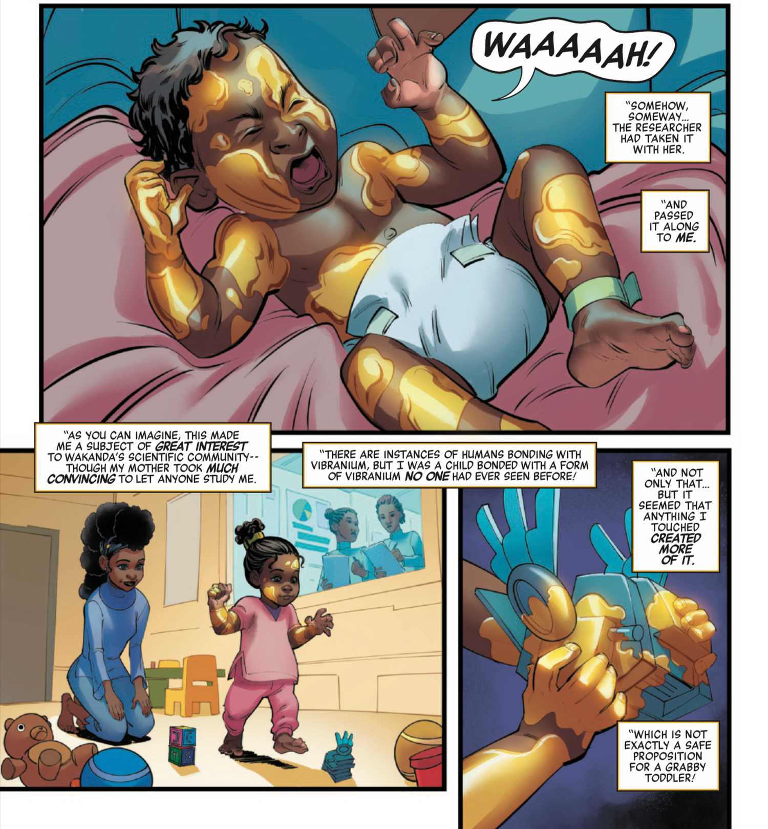 Durante el fascinante origen de superhéroes de Abena Adebayo, se observa que otros humanos se han unido con Vibranium antes, pero el joven héroe es especial ya que su versión de la sustancia aún es relativamente desconocida. Aunque ha estudiado en Wakanda e incluso entrenó junto a los guerreros Dora Milaje, el Gold Tiger ha pasado la mayor parte de su infancia aprendiendo a controlar sus habilidades para transformar artículos que toca en el vibranium dorado. Concediendo nuevos poderes extremadamente geniales pero peligrosos, todavía hay mucho que explorar sobre los orígenes del Vibranium de oro y cómo el meteorito se unió a Abena como un bebé.