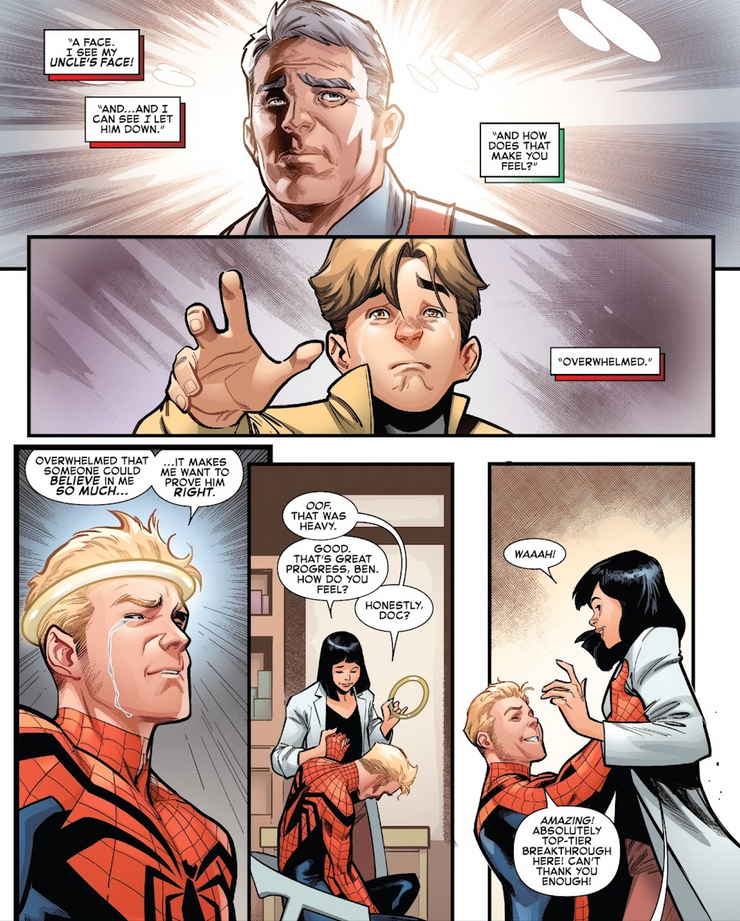 Al comienzo del número, Ben se encuentra cara a cara con un rostro de pesadilla del tío Ben, viendo una imagen de él de la infancia de Ben… es decir, la infancia de Peter. ben siente “… abrumado de que alguien pudiera creer tanto en mí… me dan ganas de demostrarle que tiene razón”. Ben tiene un gran avance, gracias en parte al dispositivo especial en su frente, pero al mismo tiempo, Marvel les ha dado una propina y les ha hecho saber a los lectores que Ben Reilly y Peter Parker están no dos personas diferentes.