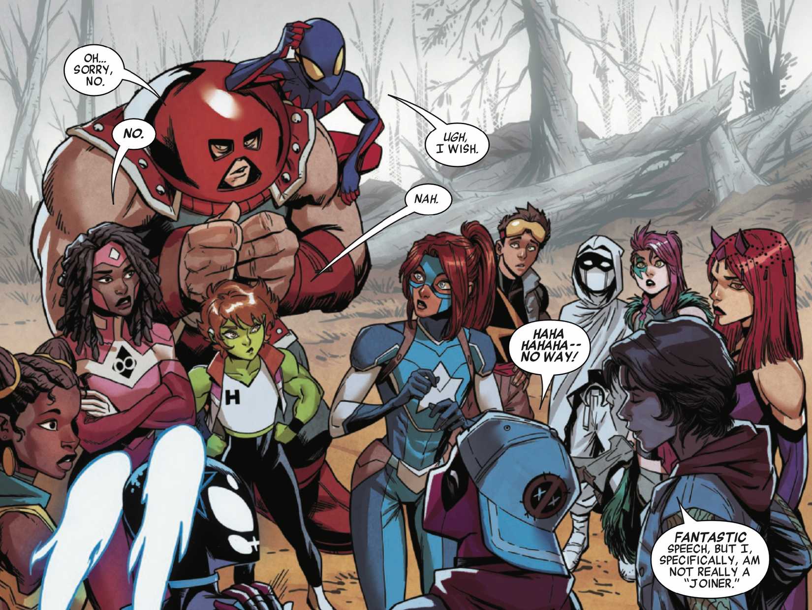 Hay algunos miembros potenciales del equipo como Kid Juggernaut, Spider-Boy y el compañero de la bruja escarlata Amaranth, que dicen que les gustaría unirse pero solo tienen muchas otras cosas, lo que podría percibirse como una excusa conveniente en lugar de su razón real para no quedarse. Si unirme a los nuevos campeones en cualquier capacidad fue realmente atractivo, siento que podrían haberlo hecho funcionar de alguna manera. Incluso el miembro potencialmente más poderoso del equipo, Hellrune, decide que ha tenido suficiente, dejando al equipo con solo cinco miembros oficiales al final de Nuevos campeones #2.