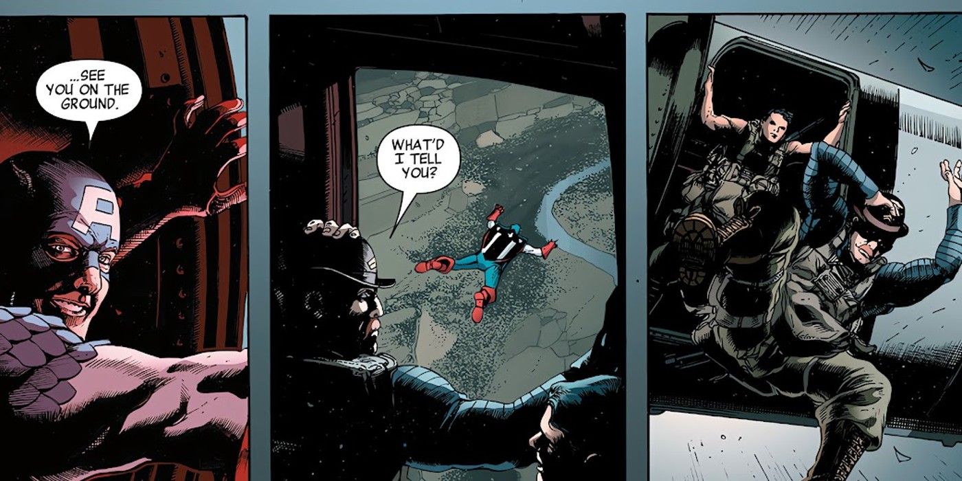 Como también se establece en la pantalla, hay demasiados momentos en los cómics que demuestran que el coraje, la determinación y otras cualidades internas de Steve son lo que lo convierten en un héroe, no la súper fuerza o habilidades que recibió después del experimento del Súper Soldado. Este es un ejemplo pequeño pero sutil que muestra cómo es más que un simple truco. Salta del avión de cabeza sin paracaídas delante de sus compañeros de armas. Obviamente, sus habilidades más potentes garantizan su seguridad, pero es uno de los muchos ejemplos del Capitán América que muestra que está dispuesto a arriesgar su cuerpo por los hombres que ha jurado proteger.