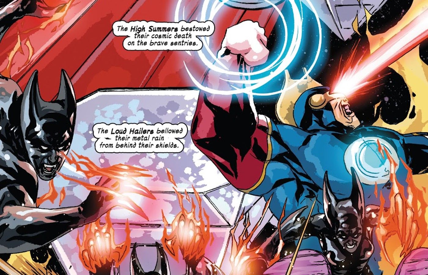Tormenta y la Hermandad de los Mutantes #3 por Al Ewing, Alessandro Vitti y Rain Beredo descubre que siniestró a Emma Frost, ahora llamada la Reina de Sangre, lanzando un ataque total contra lo que queda de Arakko cientos de años después del inicio de la pecados de siniestro. Si bien toda su vanguardia consiste en una quimera horrible basada en los mutantes favoritos de los fanáticos, una de las más peligrosas tiene el nombre en código “High Summers” y se describe en la página de datos como una mezcla de Cyclops, sus hermanos Havok y Vulcan, y su viejo enemigo. el Monolito Viviente. Pero mientras que Alex y Gabriel Summers se describen como proyectistas de energía y control de energía respectivamente, Scott se distingue del resto del clan Summers como proyectista de fuerza, una diferencia sutil pero notable que sin duda cambiará la forma en que muchos entienden sus habilidades.