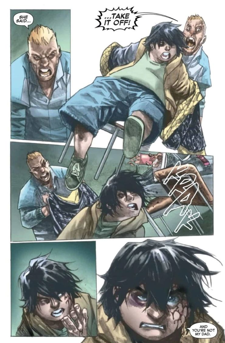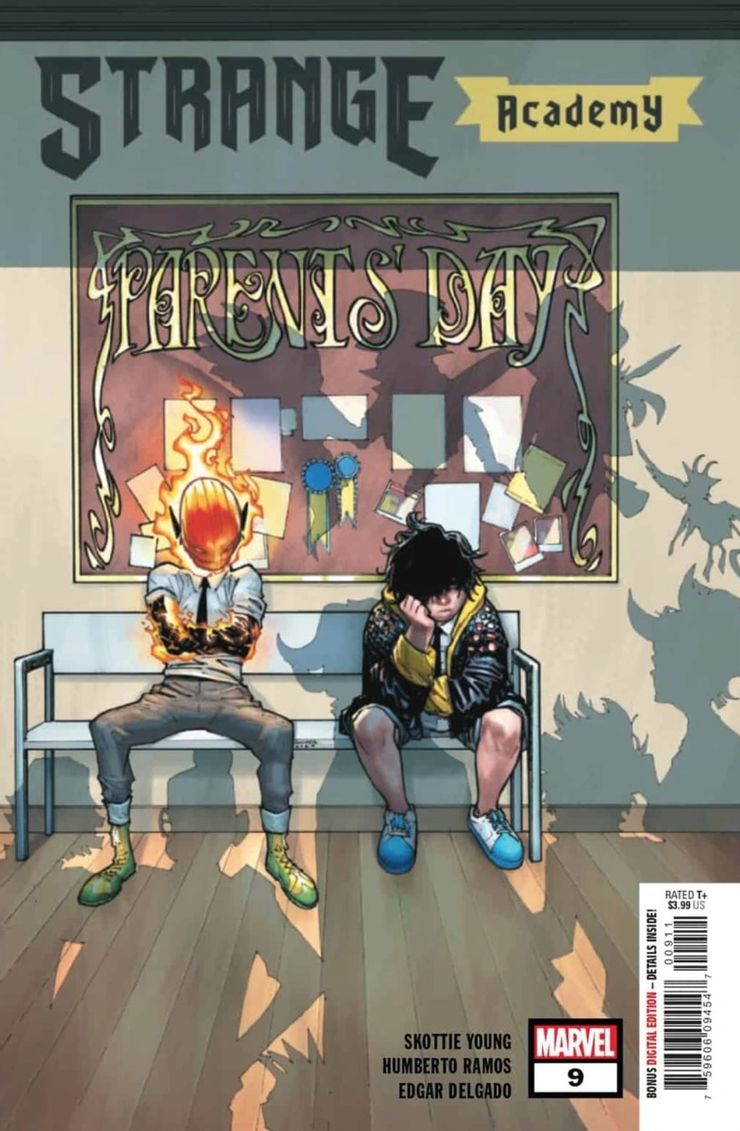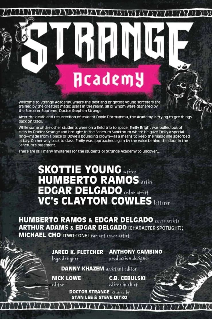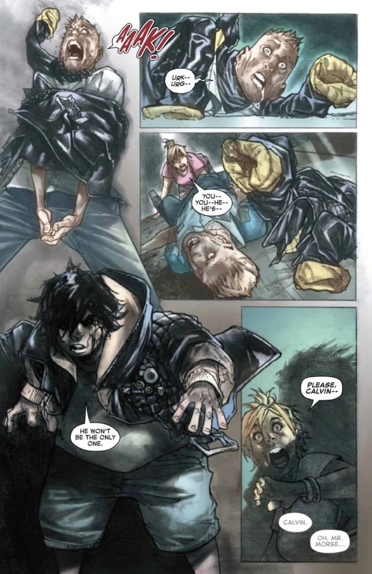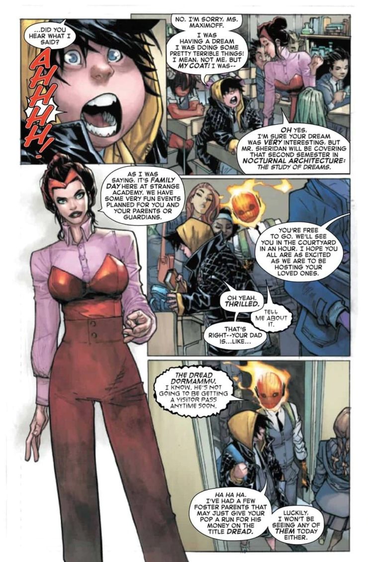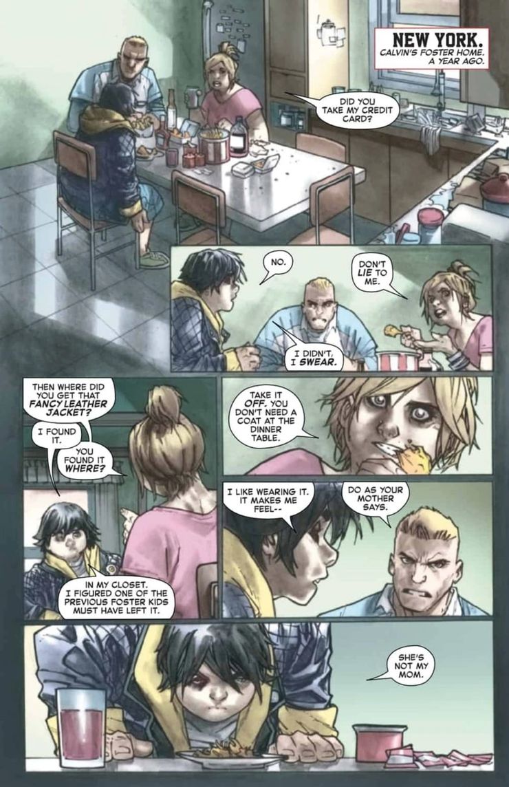 Lamentablemente, los artefactos encantados no siempre son agradables. En nuevas vistas previas de Academia extraña # 5 por Skottie Young, Humberto Ramos y Edgar Delgado, Calvin Morse sueña despierto en clase sobre su tiempo como niño adoptivo. En el sueño, sus padres adoptivos le preguntan a Calvin dónde consiguió su chaqueta. Calvin responde diciéndoles que ya estaba en su habitación, pero eso no impide que sus tutores le pregunten si robó su tarjeta de crédito. Después de que se niega a quitárselo, su padre adoptivo intenta quitárselo; resulta que fue una muy mala idea.