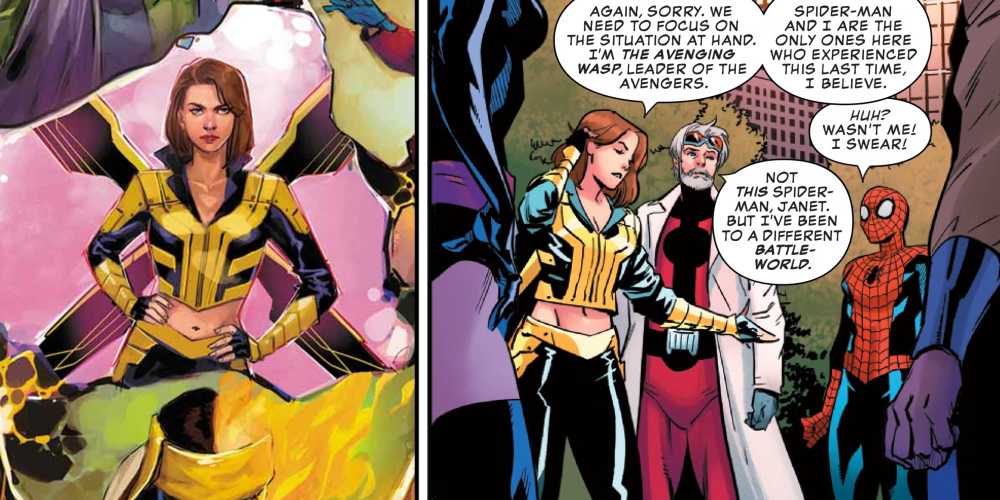 Parece que la creciente variedad de héroes será dirigido por la avenga Wasp, una versión de Janet Van Dyne que perdió a su esposo Hank Pym al principio de su carrera de héroes. El disfraz moderno sugiere que el universo de Wasp comenzó más tarde que la continuidad clásica de Marvel, pintándola como un héroe más mecanizado y centrado en gadgets que uno cuyos poderes están vinculados a su biología.