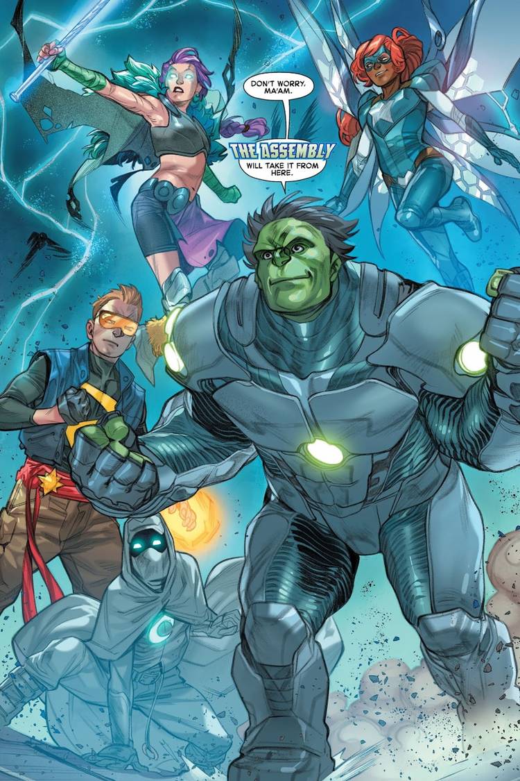 Después de una breve y oscura mirada al año 2024, La red del hombre araña #1, la Asamblea debutó oficialmente por primera vez en Mujer araña #7, salvando la vida de Spider-Woman de Zzzax. El grupo, compuesto por Cadet Marvel, Hellrune, Titan, Moon Squire y Liberty, fue presentado como adolescentes locales de San Francisco, todos inspirados por Los Vengadores para convertirse en superhéroes. Mujer araña #8, cada miembro del equipo reveló cómo obtuvo sus poderes, pero algo parecía extraño, ya que la miembro Liberty experimentó dolores de cabeza repentinos y misteriosos destellos de experimentación en sus recuerdos.