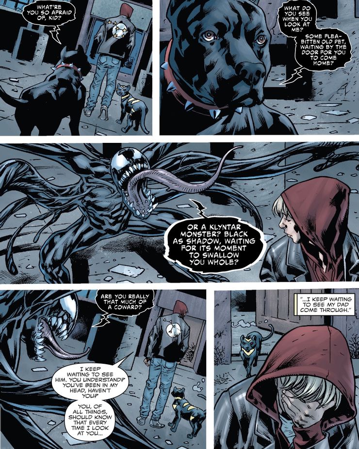 Dylan está teniendo muchas dificultades para hacer frente a la muerte de su padre. Sin opciones y sin saber a dónde ir ahora que está siendo perseguido, lo único de lo que Dylan está seguro es que no quiere convertirse en el nuevo Venom. Mientras que el simbionte finalmente confronta a Dylan y asume que el hijo de Eddie está demasiado asustado para vincularse, Dylan revela que la verdad es mucho más trágica: ambos tienen los mismos sentimientos de pérdida y dolor. Dylan ni siquiera puede mirar al simbionte sin pensar en su padre.