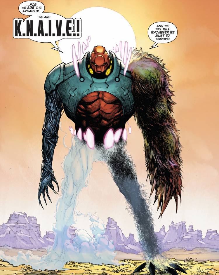 Antes de que KNAIVE creara un cuerpo físico, ya era quizás la IA más poderosa en la historia de Marvel Comics, y eso se debe a los otros sistemas que se utilizaron para crearla. Arcadium fue la evolución de varios sistemas de inteligencia artificial previamente establecidos, incluidos los de Beyond Corporation, Oscorp, Hydra, Stark International, Baxter Building, AIM, Roxxon y Danger Room. Por eso la realidad artificial que podía crear era tan realista y por eso la IA tenía habilidades telepáticas.