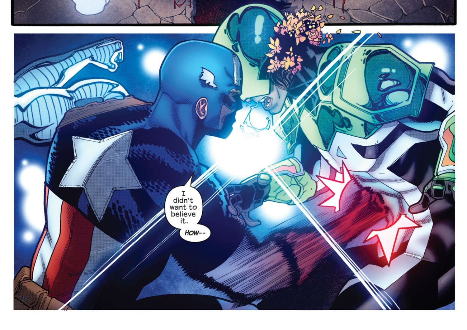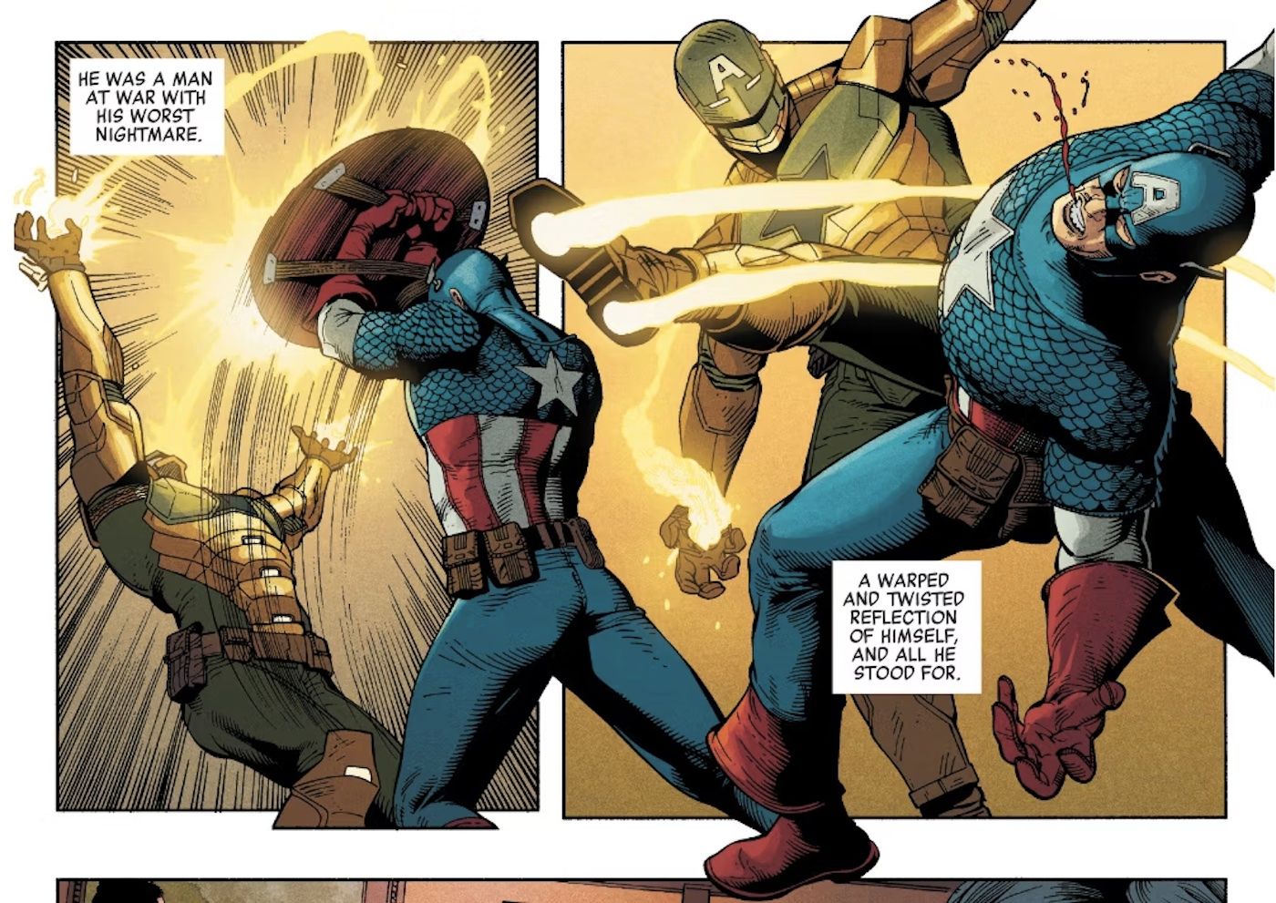 “/> El arma y el ataque del Capitán Krakoa a Ben Ulrich finalmente conducen a otro enfrentamiento entre el villano y Steve Rogers. Esta vez, el Capitán América prevalece, aunque el Capitán Krakoa demuestra tal habilidad en el manejo de su escudo que apenas es necesario quitarse la máscara. Pronto, dos versiones de Steve Rogers se miran fijamente, junto con dos agendas diametralmente opuestas.