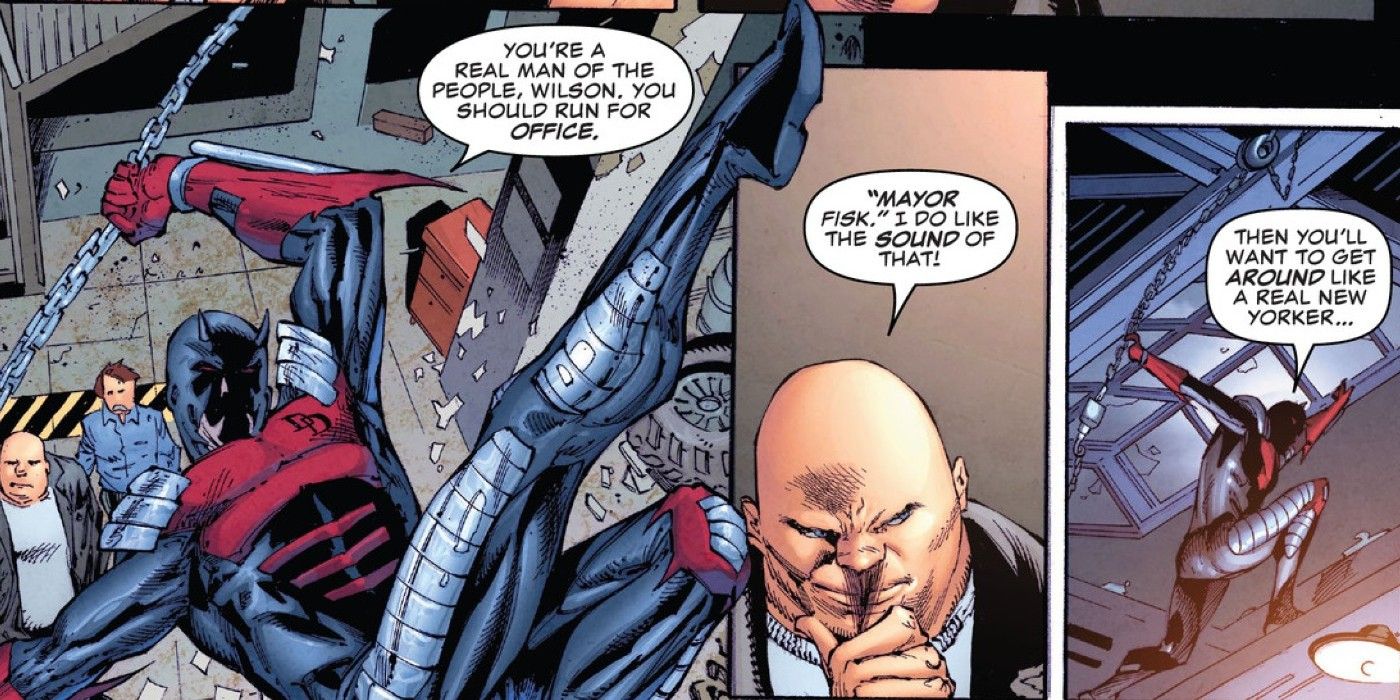 Y ahora, se ha revelado el origen secreto de la candidatura a la alcaldía de Kingpin. El comentario improvisado de Daredevil acerca de que Fisk era un hombre del pueblo tenía la intención de ser sarcástico, pero Kingpin, imperturbable como siempre, lo convierte en un cumplido. A Kingpin le gustó el sonido de “Mayor Fisk” y lo hizo realidad unos años después. El comentario de Daredevil colocó la semilla en la mente de Kingpin, quien la aprovecharía y la usaría para avanzar en su propia búsqueda de poder y control. Como alcalde, Kingpin logró hacer lo que Doctor Doom, Red Skull y otros no lograron: poner de rodillas a los héroes del Universo Marvel.