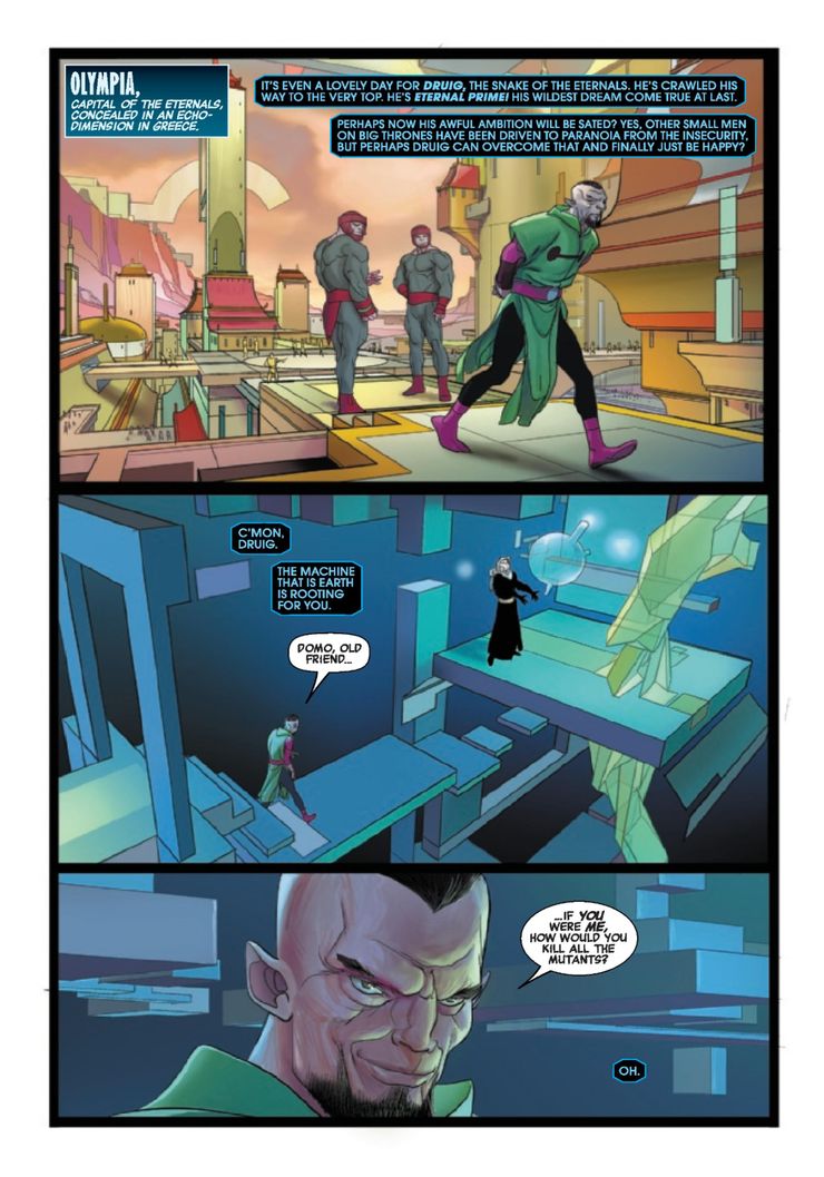 Domo revela que la “maravilla” de la poderosa arma es que está hecha de tecnología generalizada, lo que significa que cualquiera podría usarla y no necesariamente se puede rastrear hasta los Eternos. Domo sugiere dejar caer el arma a través de un nodo debajo de Krakoa, el hogar de los X-Men, lo que resolvería instantáneamente el “problema mutante” en la Tierra. Domo agrega que los mutantes en Arraki no sabrán quién lanzó la bomba y que estallaría una guerra civil debido a la confusión. Druig no pierde el tiempo en poner el plan en marcha y le dice tímidamente a Domo que quiere aniquilar a los mutantes de inmediato.