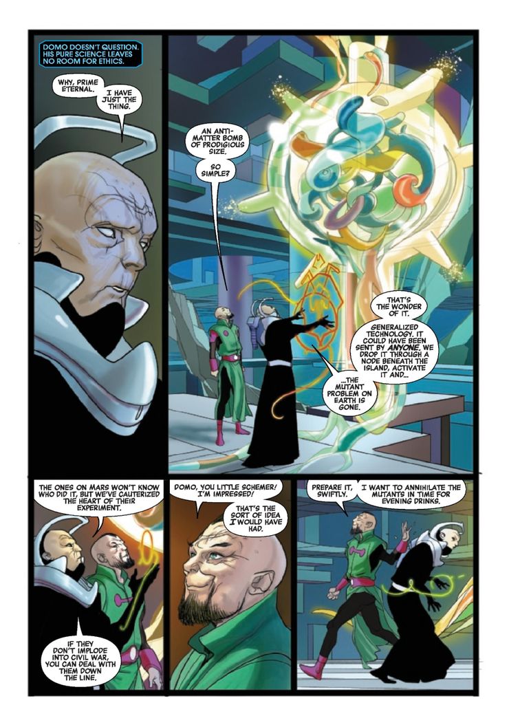 En una nueva vista previa de A.XE: Víspera del Día del Juicio #1 el escritor Kieron Gillen y el artista Pasqual Ferry, la Máquina muestra que mientras los Vengadores y los X-Men se relajan, Prime Eternal Druig está planeando cómo acabar con los mutantes y su exceso de desviación. Entonces Druig le pregunta a Domo cuál es la forma más eficiente de matar a todos los mutantes. Sorprendentemente, Domo tiene una forma práctica y discreta de hacerlo, revelando un arma poderosa en forma de bomba de antimateria.